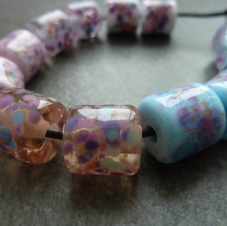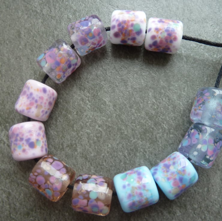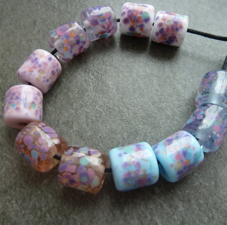 A set of 12 lampwork glass beads made with blue, pink white and clear glass, shaped into barrels and rolled in pink/blue glass frit.