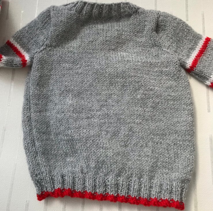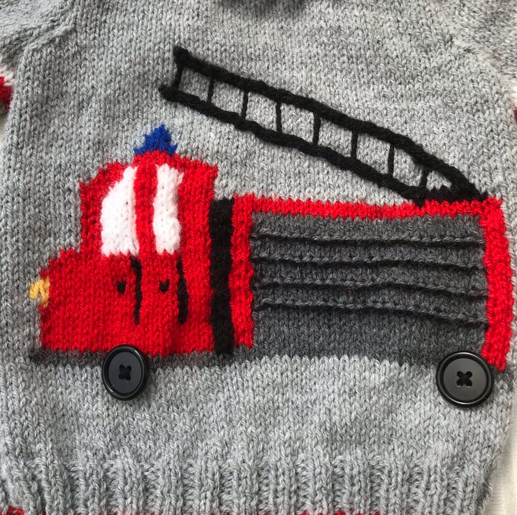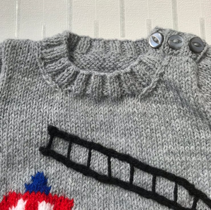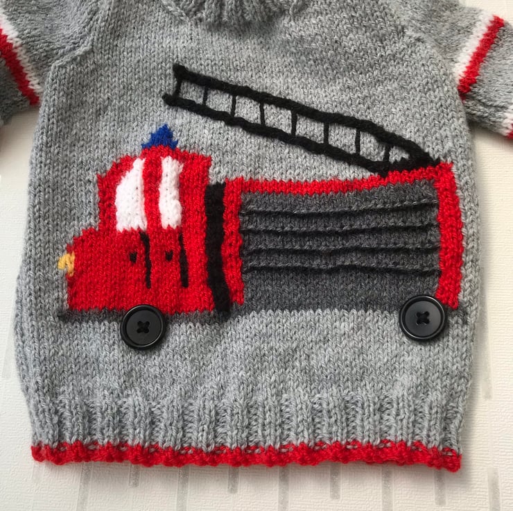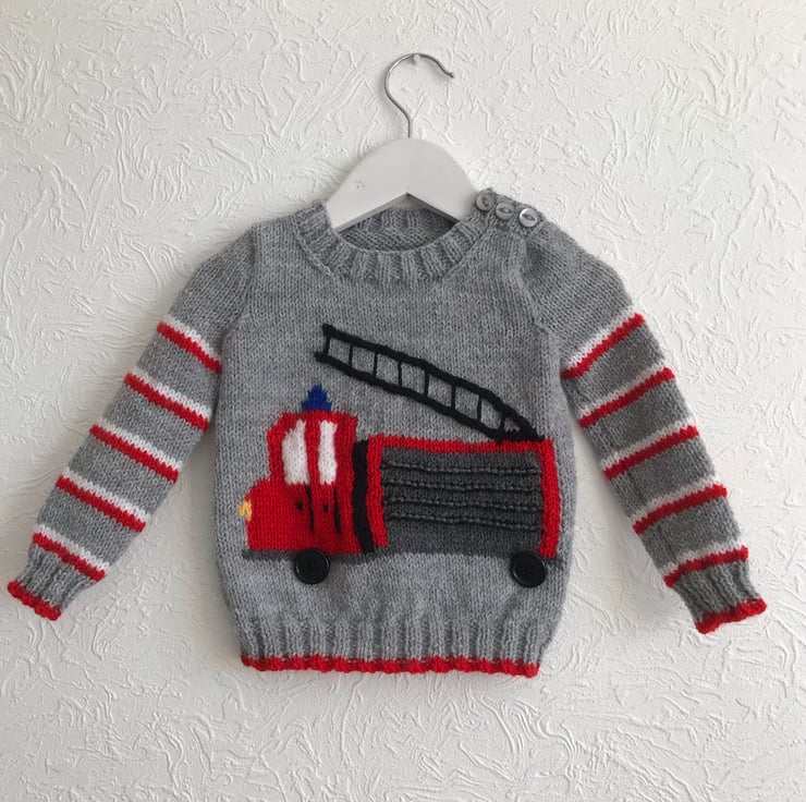 This jumper is hand knitted in an acrylic yarn and features a large fire engine picture on the front. The body of the jumper is a light grey with a red band at the hem. The sleeves are grey with red and white stripes and a red hem. The jumper has a round neck and fastens on the shoulder with three buttons. The fire engine is worked using the intarsia method of knitting with the ladder being added afterwards. It has two large black buttons as wheels so care should be taken to ensure they remain secure.