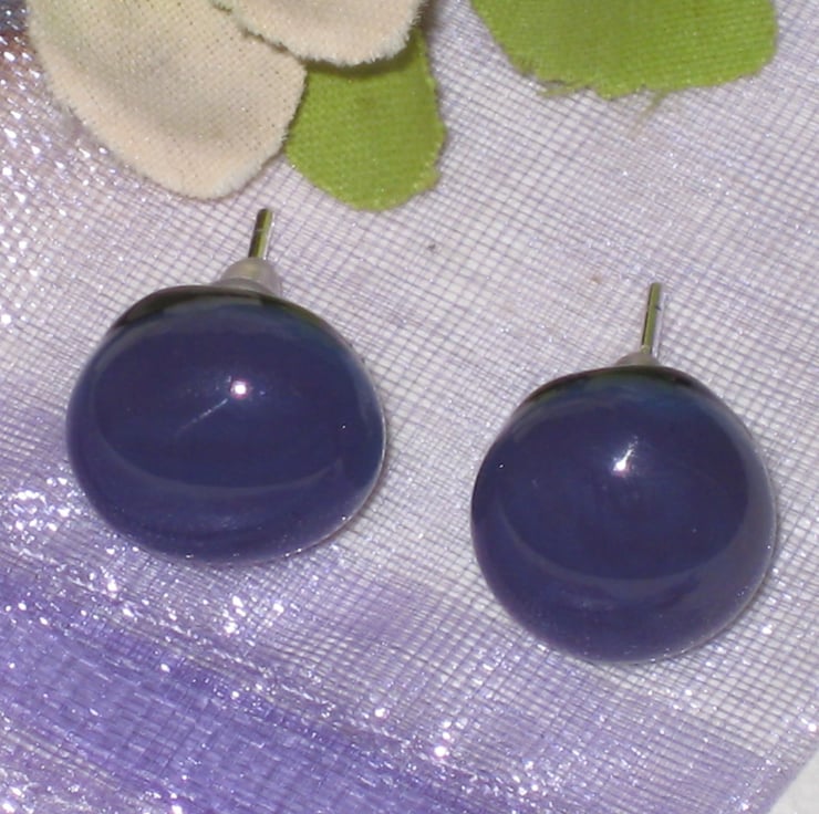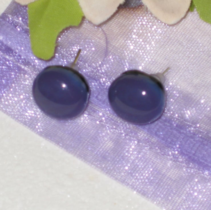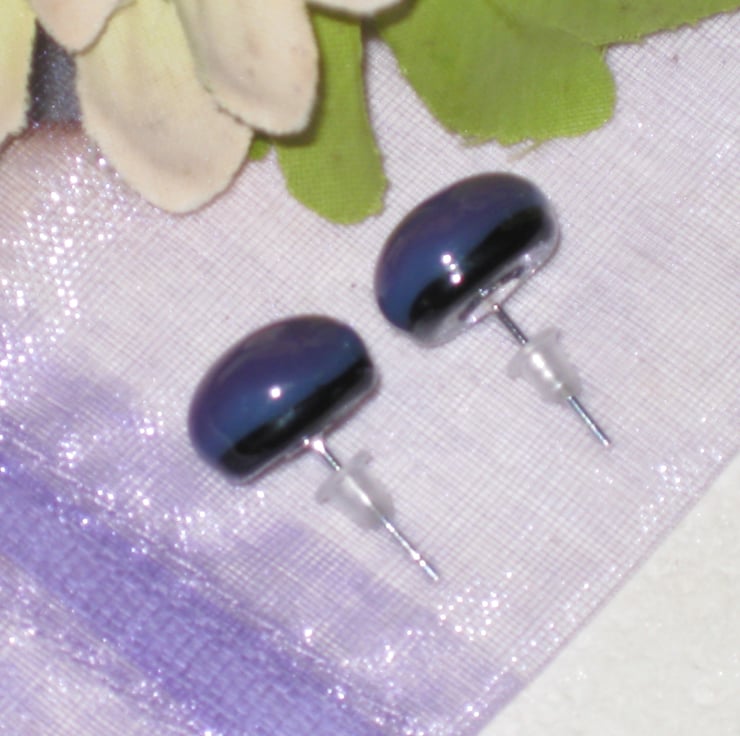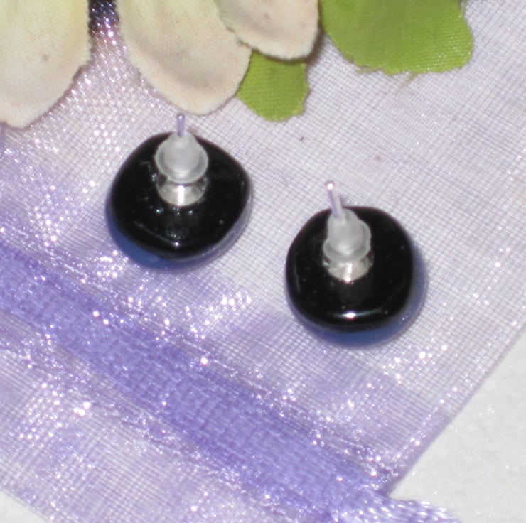 Pair of dark purple on black 11mm round stud earrings. Handmade from quality opaque Bullseye glass. Created by kiln fusion. Sterling silver posts with soft rubber hypoallergenic safety stoppers.
