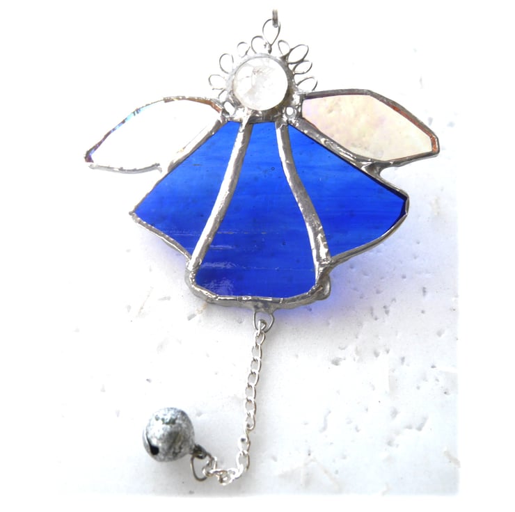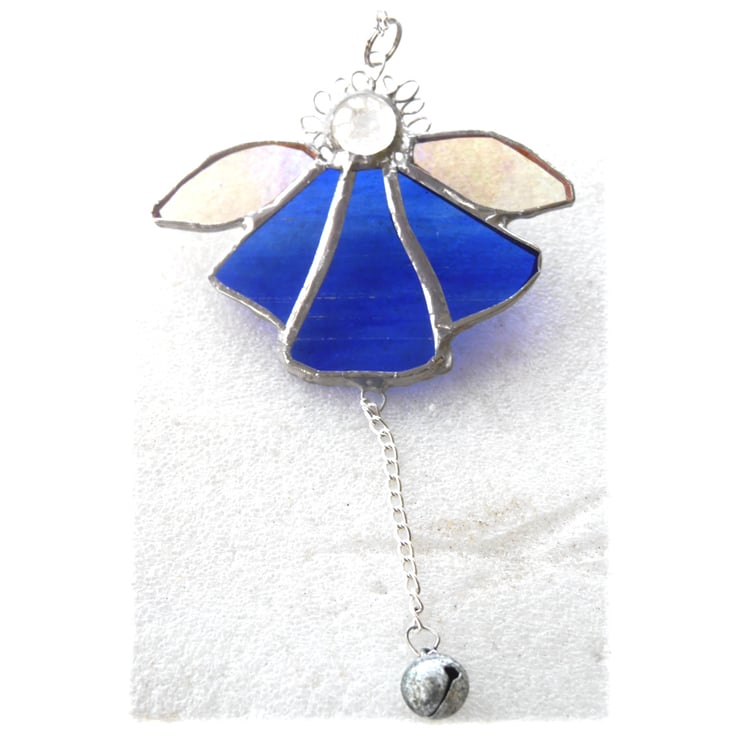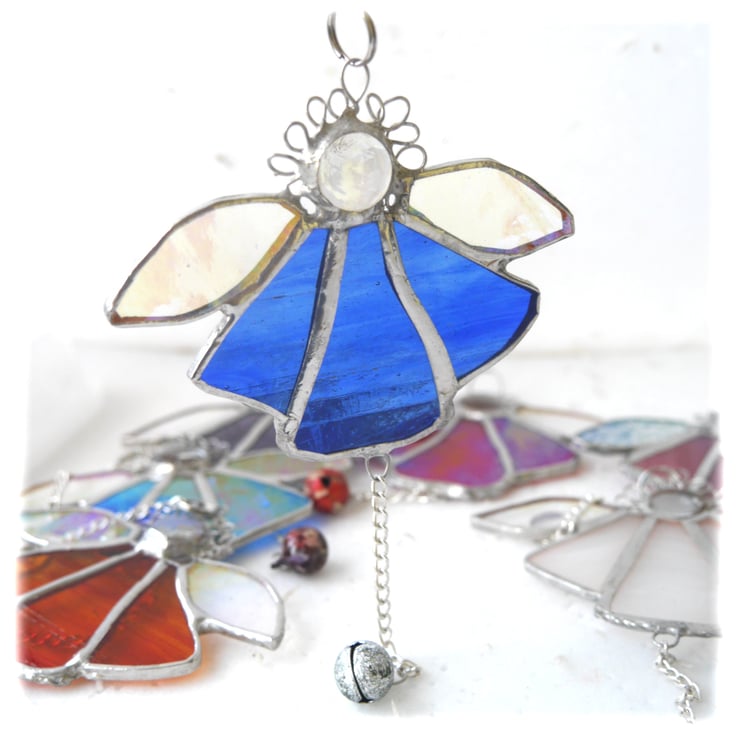 This is a stained glass suncatcher, an angel, made using the Tiffany copper foil technique.