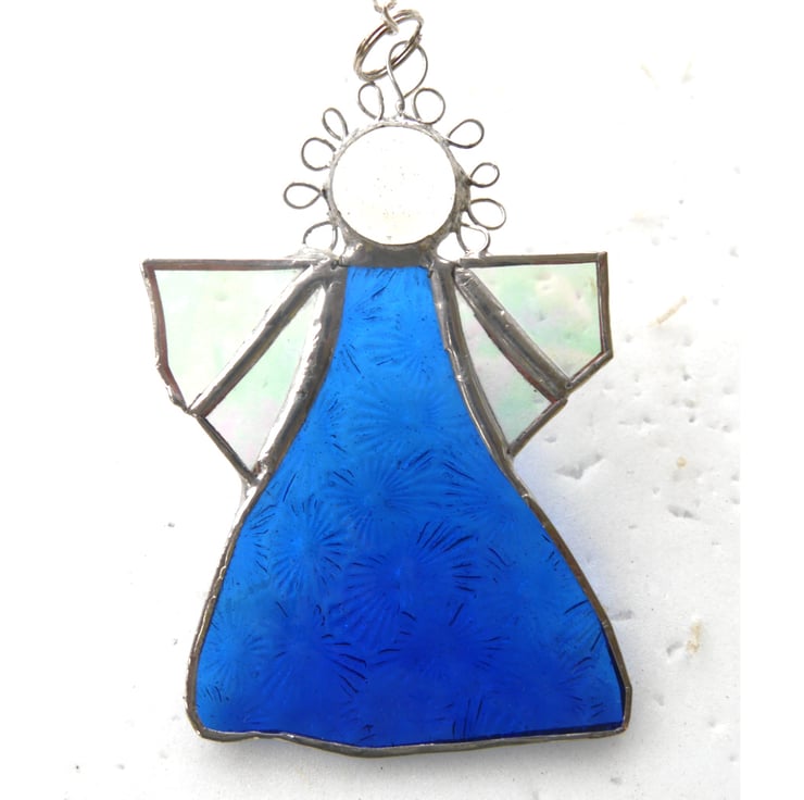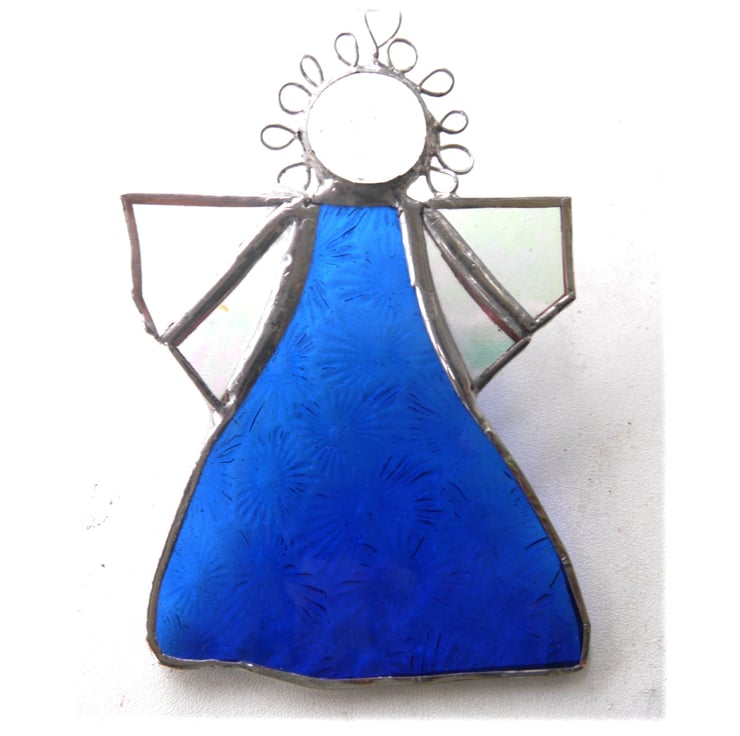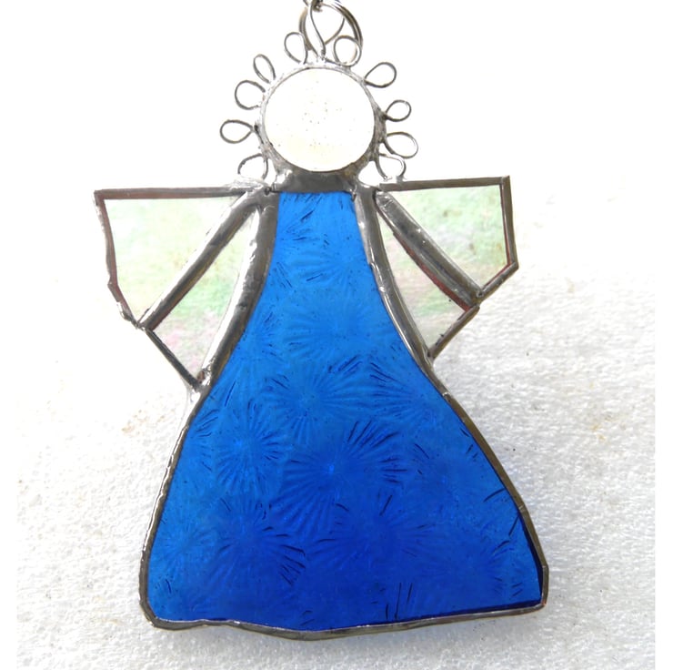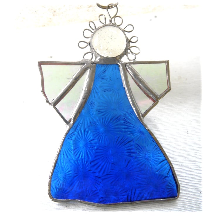 A stained glass suncatcher, an angel, made using the Tiffany copper foil technique.