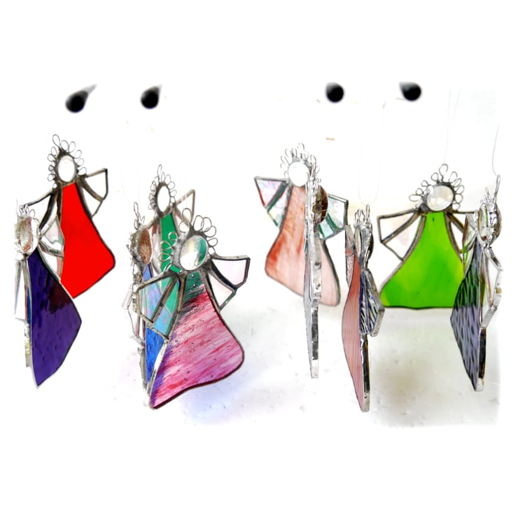 They have curly hair as do all Joysofglass Angels and hang from a loop of strong fishing line (so they are easily hung from your tree). The dresses are cut from coloured glass and the wings from iridescent clear.