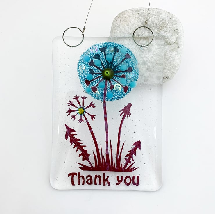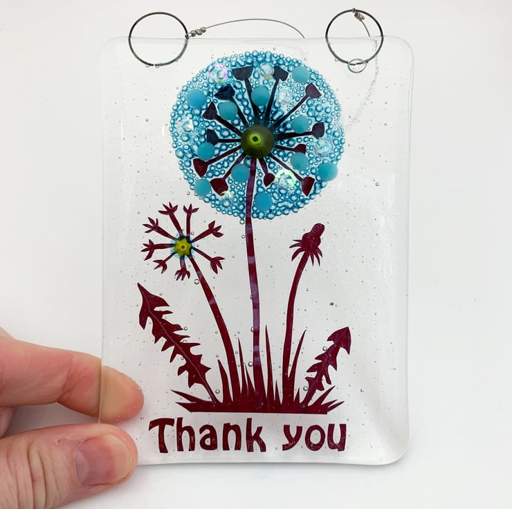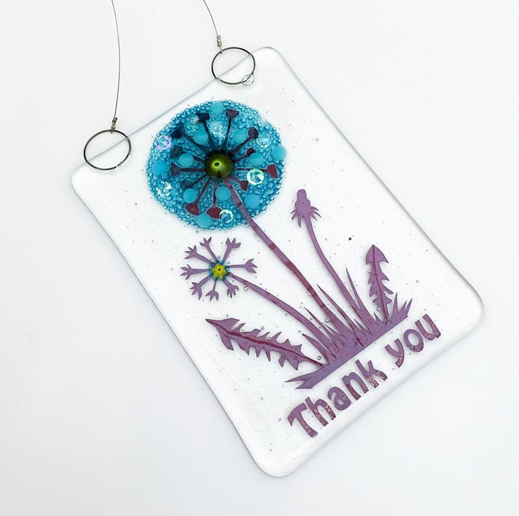 Fused glass hanging dandelion suncatcher, in shades of turquoise, featuring a handcut copper foil dandelion and the words "thank you." This would make a beautiful gift for a special friend and looks lovely in a window. Please note, I can make these to order to include a name, just contact me and ask.