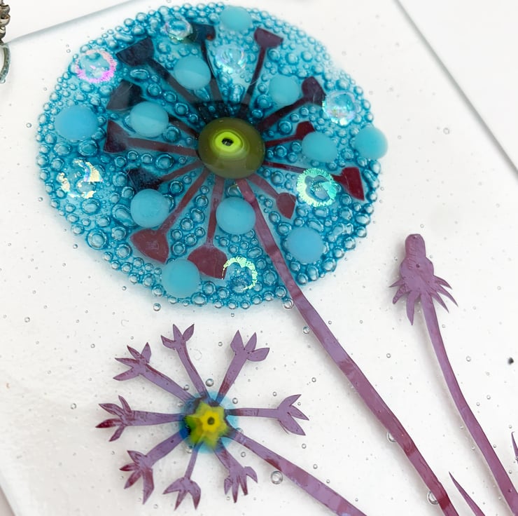 To make this fused glass hanging, I hand cut copper foil with a scalpel to make the dandelion and the letters and carefully arranged them on transparent art glass. I then painted specialist glass paint which turns to bubbles in the kiln and capped it with another piece of art glass. I then fused it overnight slowly in my kiln. Finally I added coloured and dichroic dots which I have made previously to give some added interest to the design. A second firing is done overnight the next day to tack fuse the dots onto the design, so that they stand proud of the glass, giving it a 3D effect.