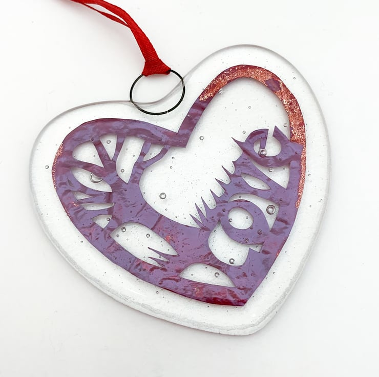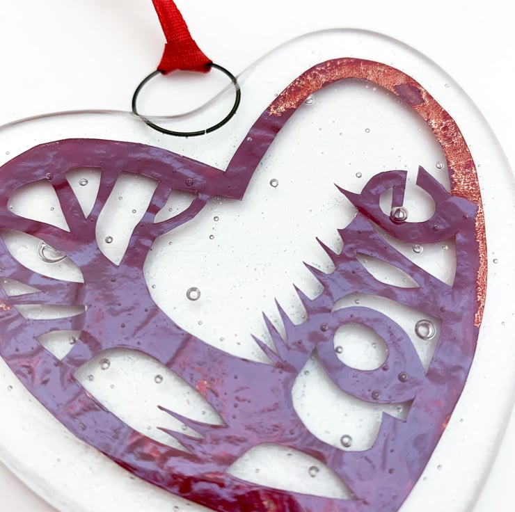 To make this fused glass hanging, I cut 2 heart shapes from transparent art glass. I then hand cut my design into very thin copper foil with a scalpel and carefully arranged between the transparent art glass. It was then fused overnight in my kiln.