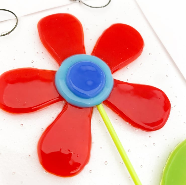 Fused glass multicoloured retro flowers suncatcher, perfect in a window, or anywhere you fancy. Inspired by my love of the retro design found on the ceramics, fabrics and wallpaper of the 1960s and 1970s. This would made a groovy gift for lovers of all things retro.