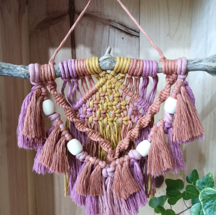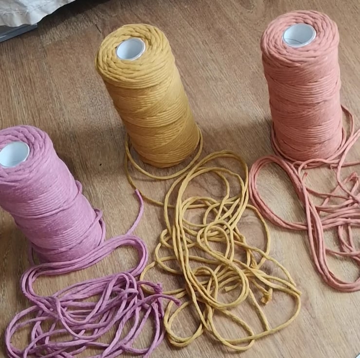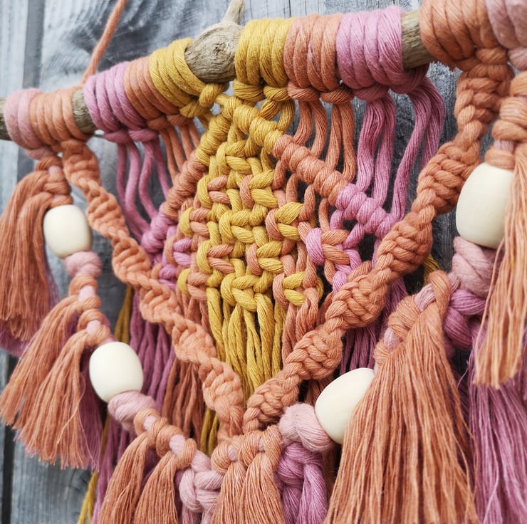 Made from 100% recycled cotton single twist cord in a beautiful combination of pastel sunset inspired colours: mustard yellow, terracotta orange, Blossom pink and blush pink.