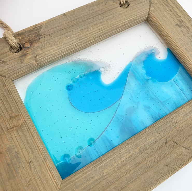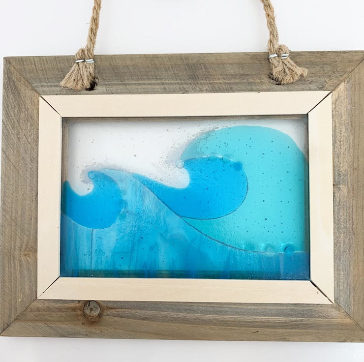 Framed fused glass wave picture. This would make a beautiful gift and looks lovely in a window or against a plain wall.