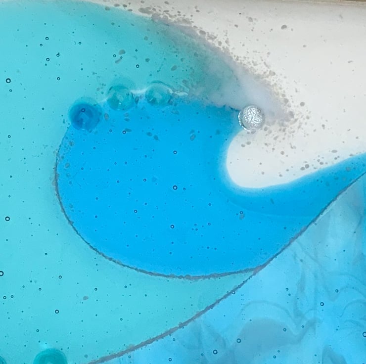 To make this fused glass hanging, I cut a rectangle of transparent art glass. Then I cut my intricate wave shapes, added powdered white glass to represent foam and fused it overnight slowly in my kiln. Finally I added the turquoise and dichroic dots which I have made previously to give some added interest to the design. A second firing is done overnight the next day to fuse the dots onto the design.
