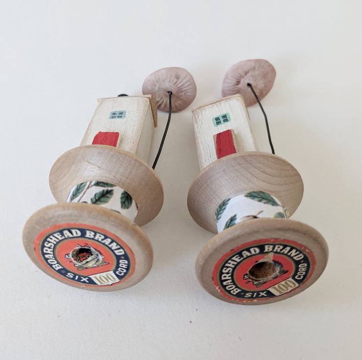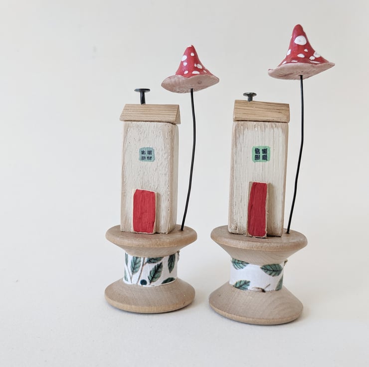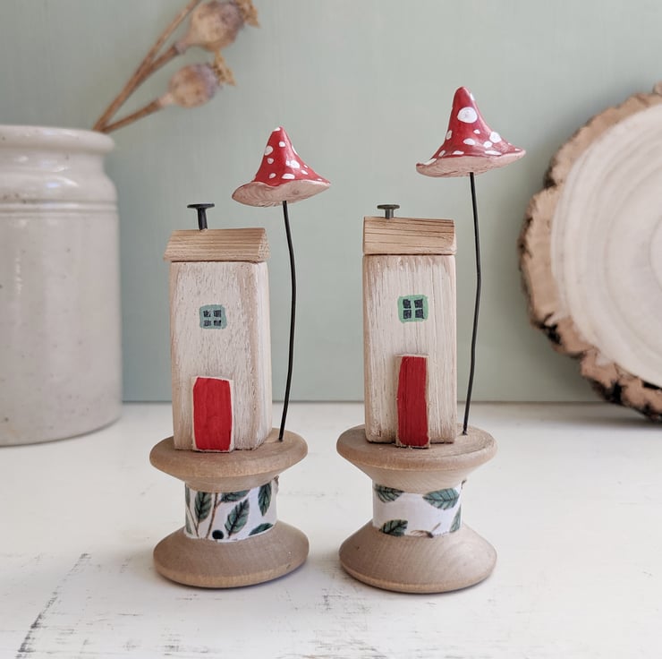 I love finding these old bobbins on rummaging trips! The tiny homes perch happily on top.