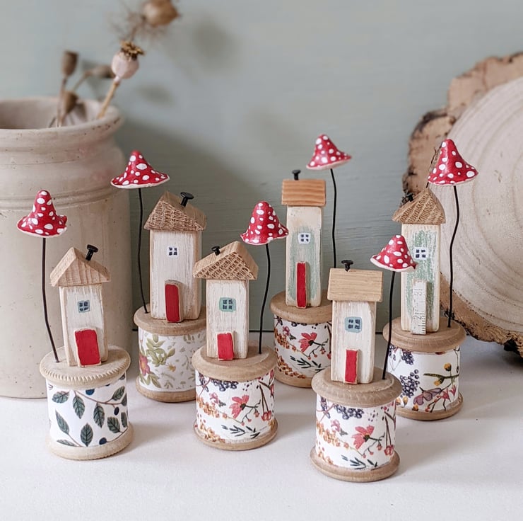 I love finding these old bobbins on rummaging trips! The tiny homes perch happily on top.