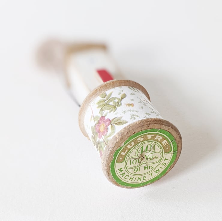 The old bobbin is decorated with patterned paper and hiding beneath is the original old vintage sewing label.