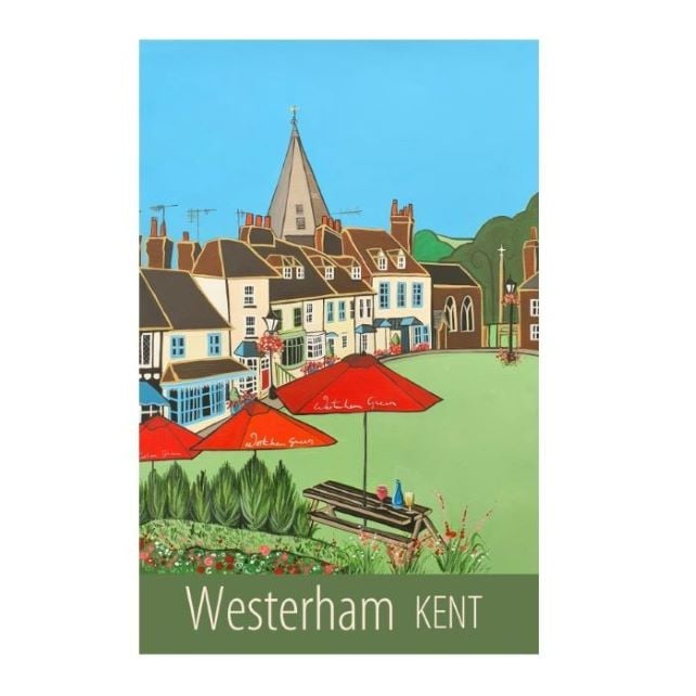 A contemporary travel poster style print of the green in lovely Westerham, in Kent, from my own original acrylic painting.