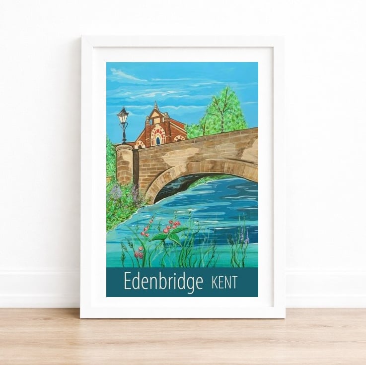 A contemporary travel poster style print of the historic bridge over the River Eden, in Edenbridge, Kent, from my own original acrylic painting. A perfect gift for those who love Edenbridge!