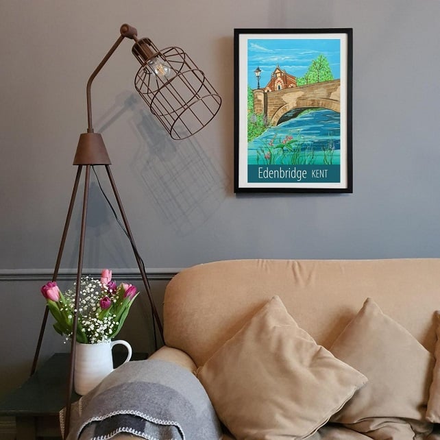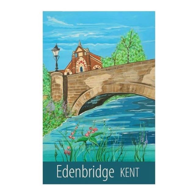 A contemporary travel poster style print of the historic bridge over the River Eden, in Edenbridge, Kent, from my own original acrylic painting.