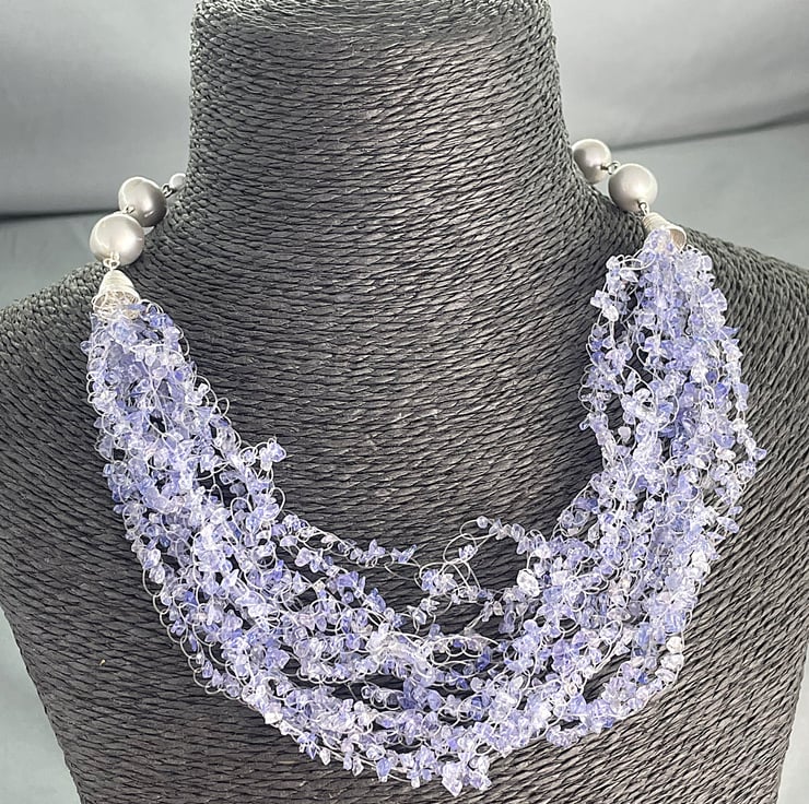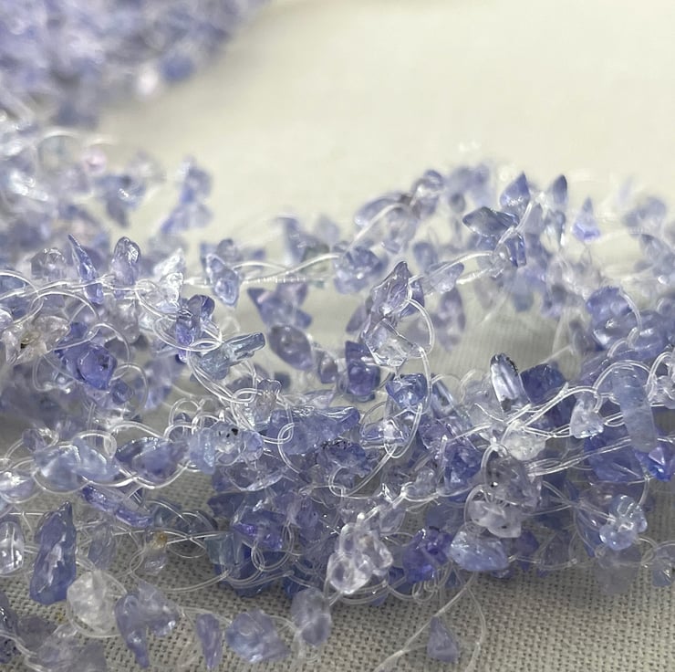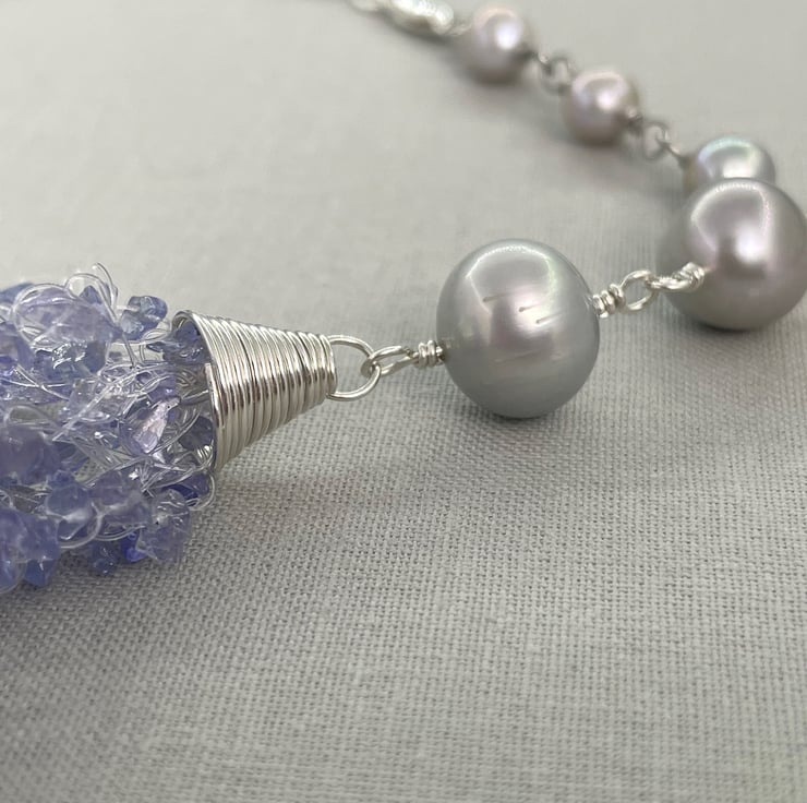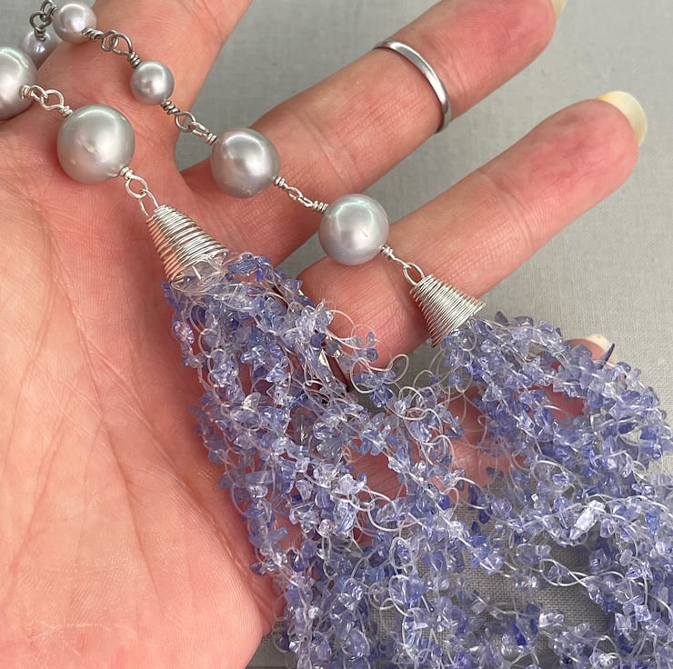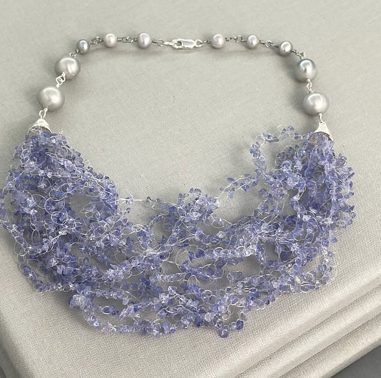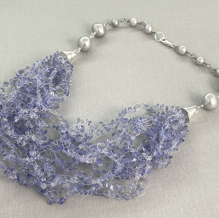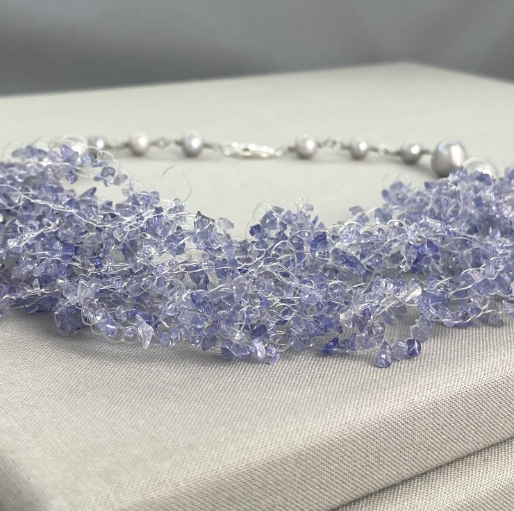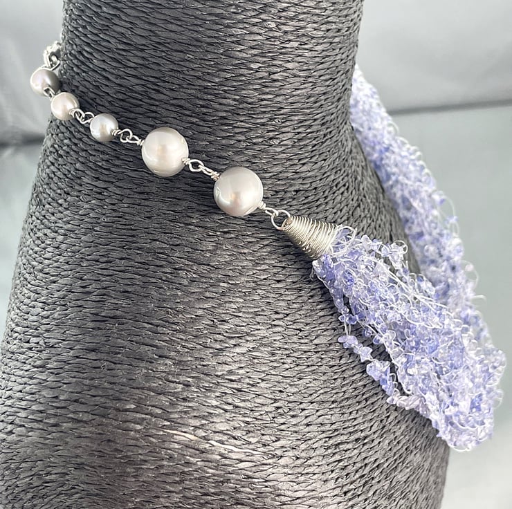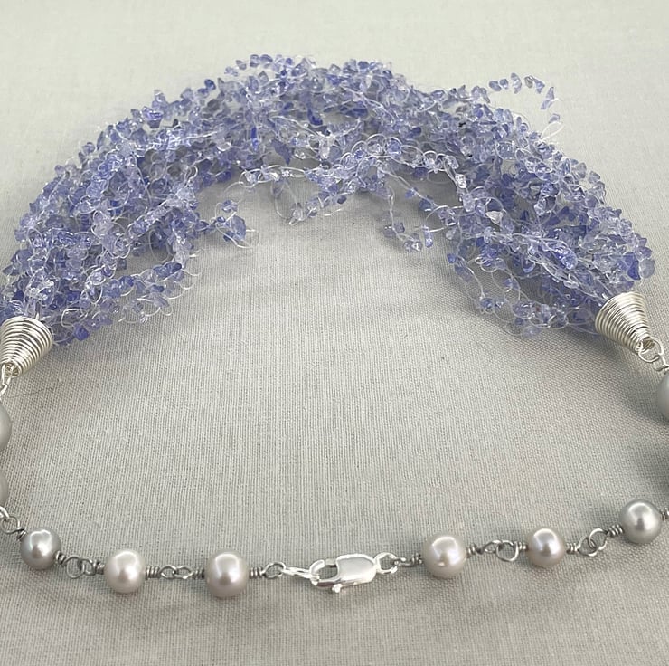 A stunning necklace choker featuring 2 metres of Tanzanite chips crocheted together with sterling silver coils and silver cultured pearls.