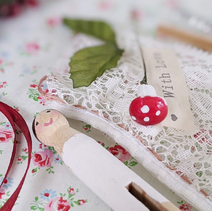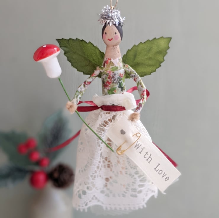Your woodland fairy holds a special toadstool wand and comes with a lace fairy skirt, woodland leaf wings and a pinned message of love.