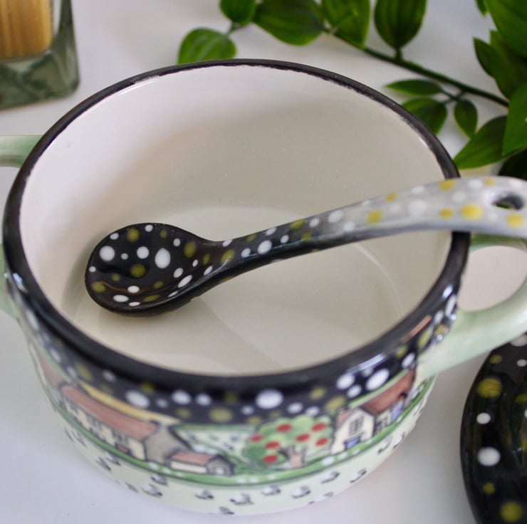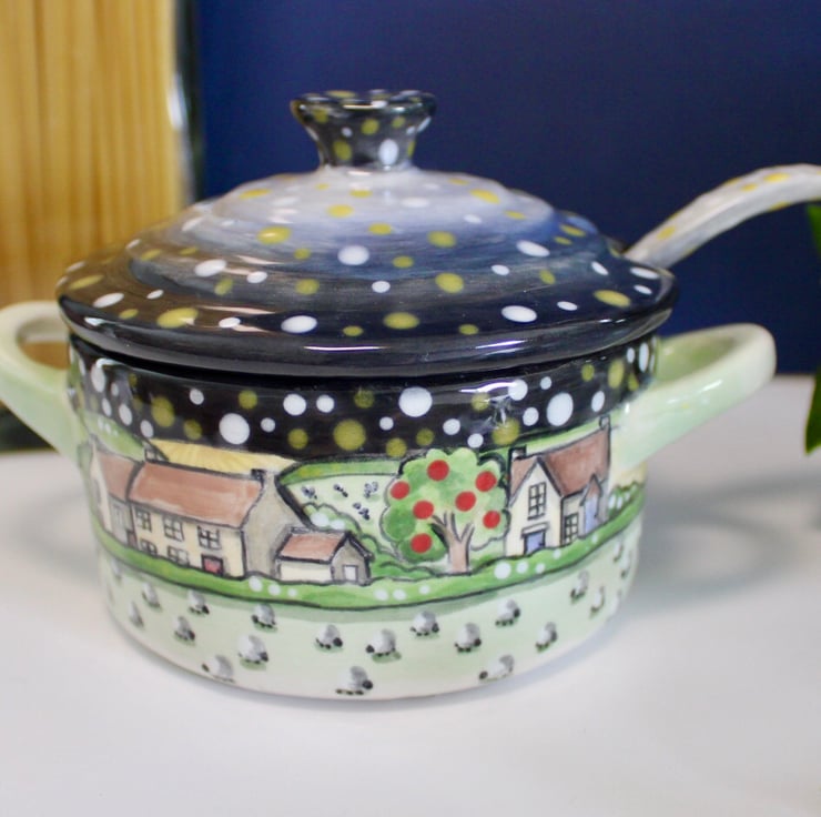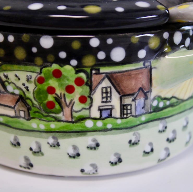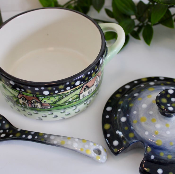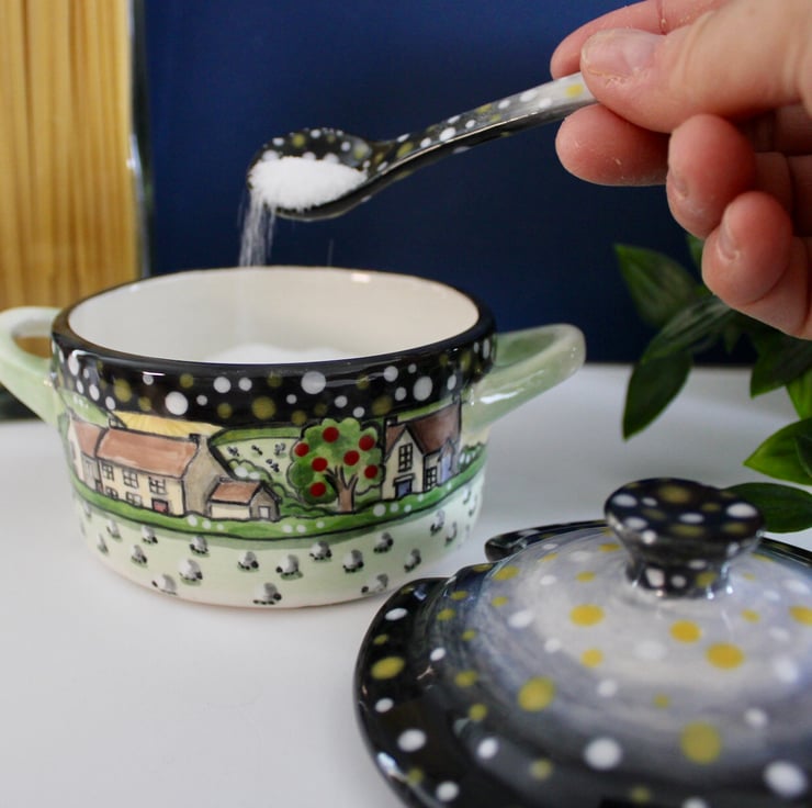 This little pot is great to have around the kitchen or dining room table for serving sea salt. A very useful salt pot with lid and spoon. Hand painted by myself ensuring all are unique. A countryside scene of little cottages nestled amongst rolling hills and field full of sheep. Under a sky full of stars.The little spoon is also painted in little stars..