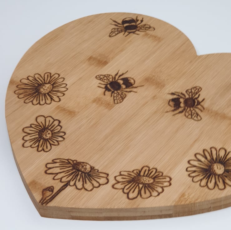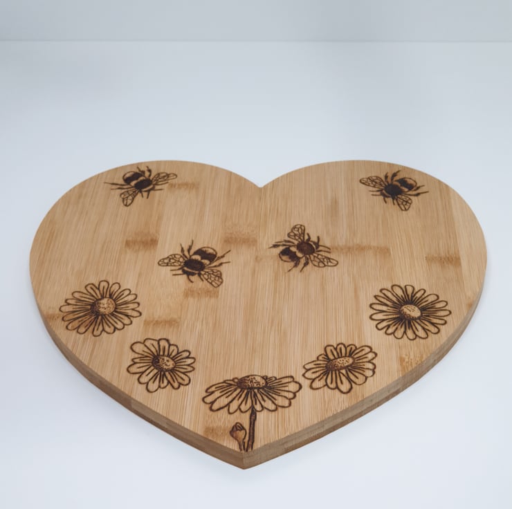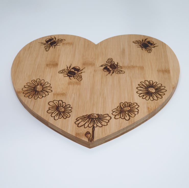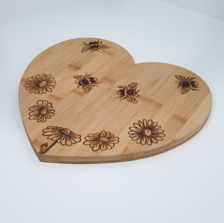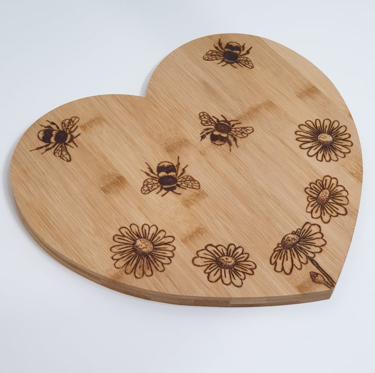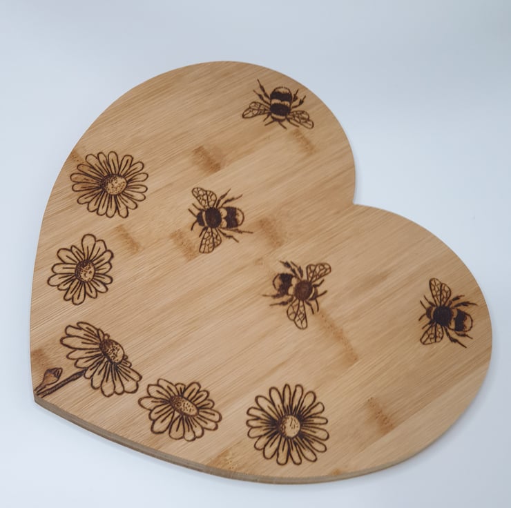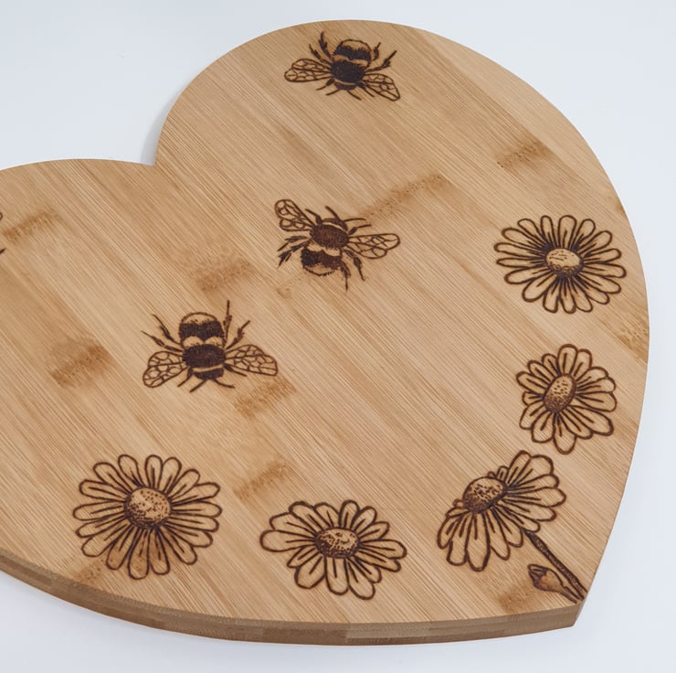 Lovely bees and daisies design heart shaped wooden chopping board or serving board made from bamboo which has been lovingly handburnt using the art of pyrography and would make s great kitchen gift. The board has been finished with food grade wood oil. The reverse of the board has been left unburnt so the board can be flipped over to preserve the design when used for chopping.