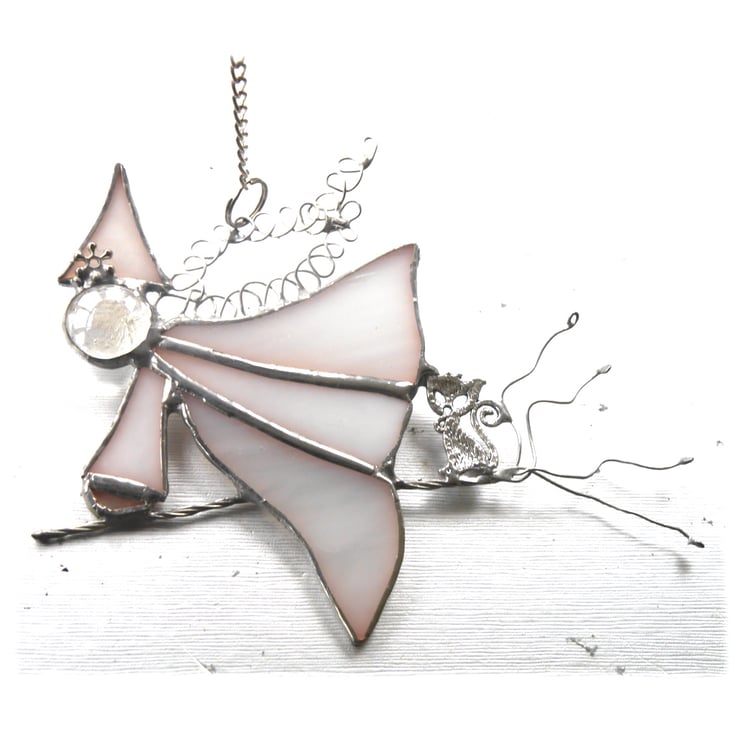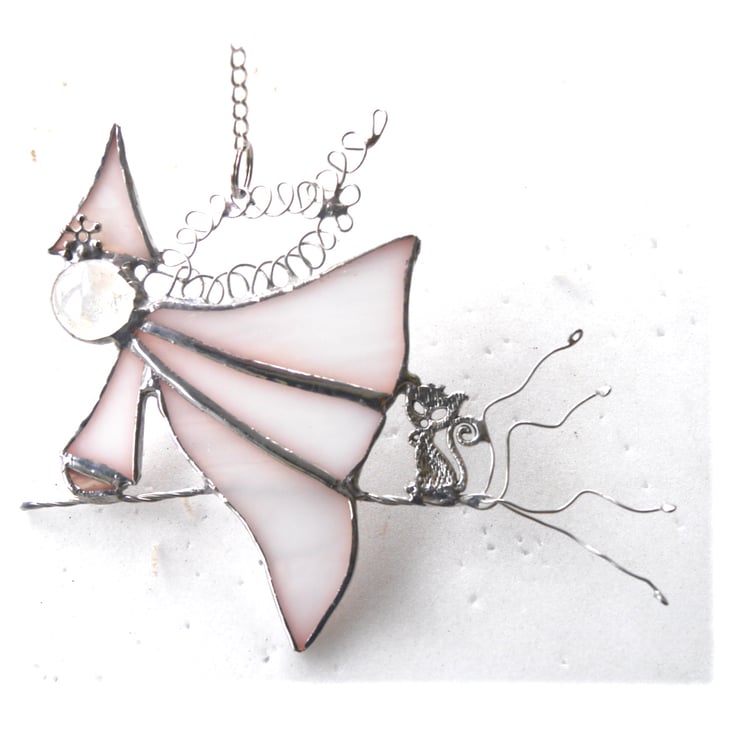 The witch is riding the skies on her broomstick which is made from twisted wire. Her cat rides behind.