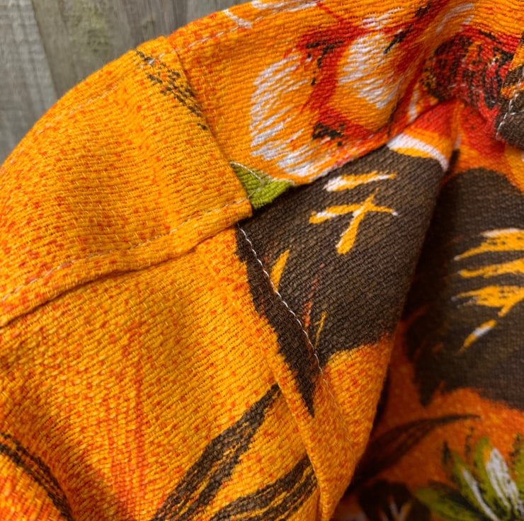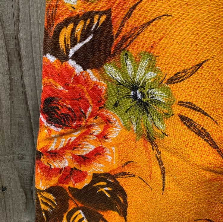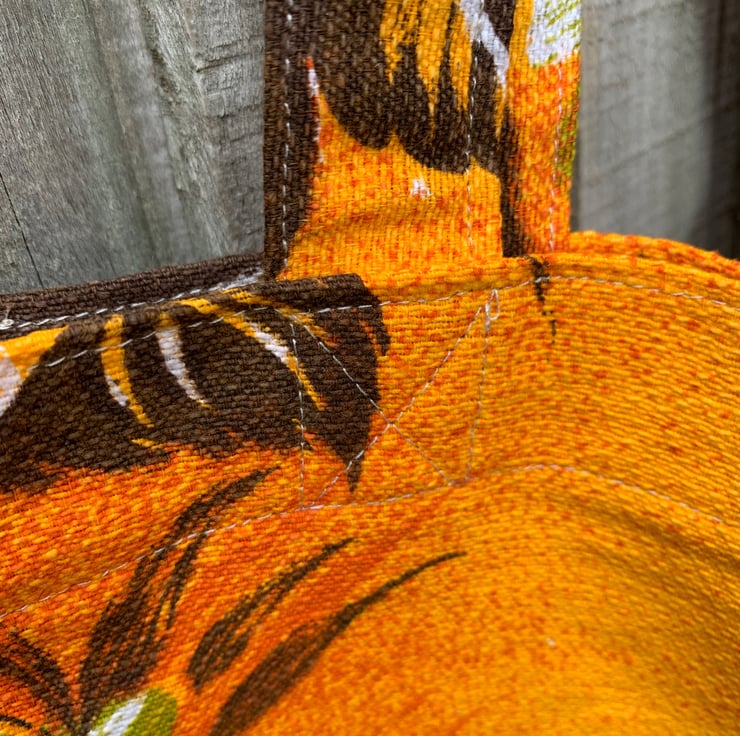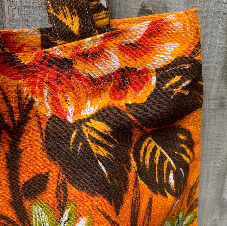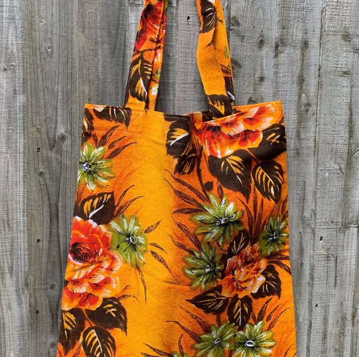 Tote bag made from bright vintage cotton-rich fabric. A vibrant rose design in shades of orange and green covers both sides of the bag. The bag has long straps which can be worn on the shoulder.