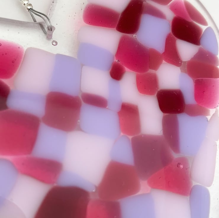 Fused glass hanging heart. Clear glass with a mosaic of different pink glass. I have used different tones of transparent and opaque pinks with a clear glass background. The glass is handcut and assembled, therefore no 2 are exactly the same. The different pinks of the glass make this really pretty hung in a window, or anywhere you fancy!