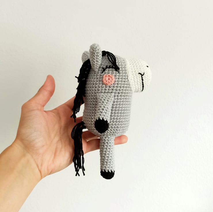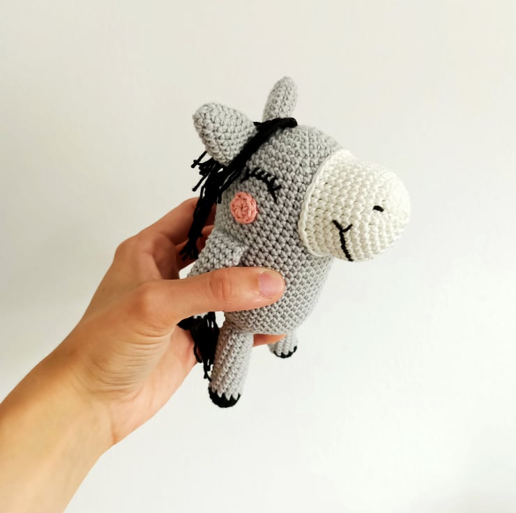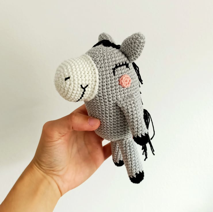 The cute donkey in the pictures has been made with 100% cotton yarn and it is IN STOCK at the moment. Let me know if you want to get yours!!