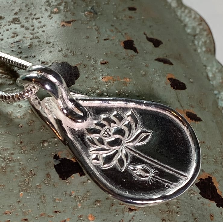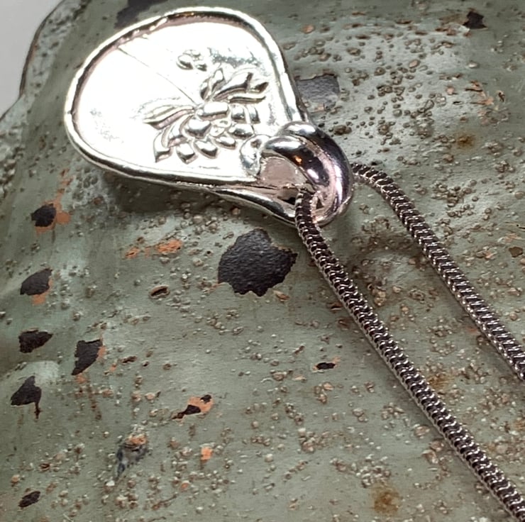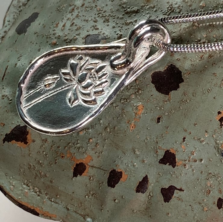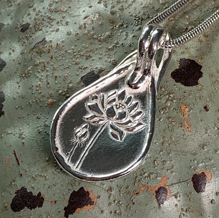 I have made this pendant by hand, it depicts a textured flower on a teardrop shape - I have hand made the curled bail attaching it to the edge of the pendant - making this an usual and unique design