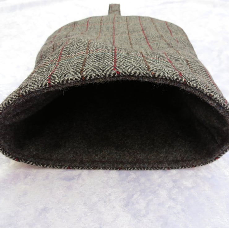 This cafetiere cosy is made from a woollen tweed fabric.