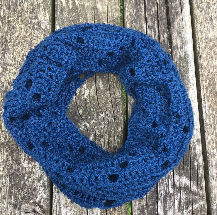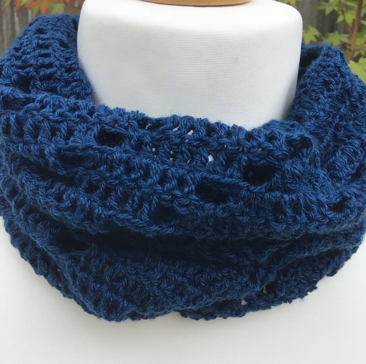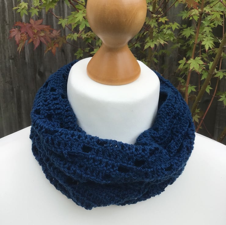 Hand made in a supersoft laceweight acrylic yarn in Navy, it sits really nicely around the neck due to the loose crochet stitch.