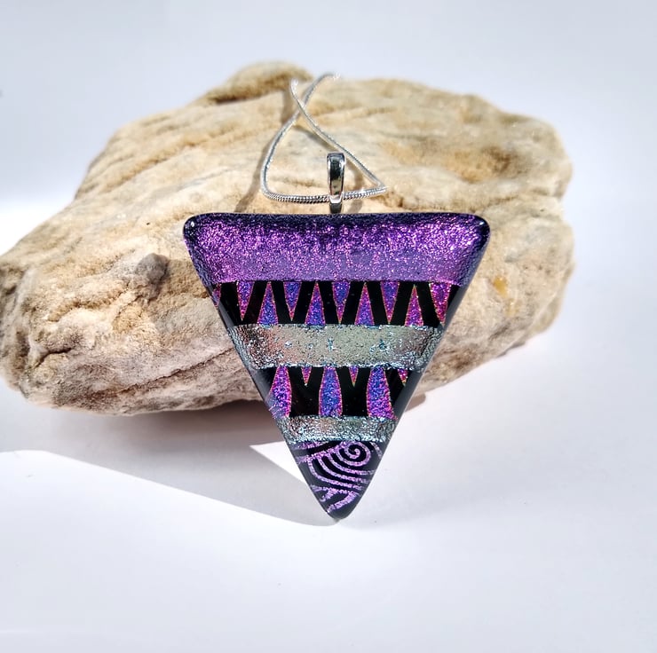 This striking pendant in vivid shades of pink, violet and silver and in an unusual triangle design really makes a statement. The dichroic glass which gives the piece its sparkle catches the light beautifully depending on the angle of the light.