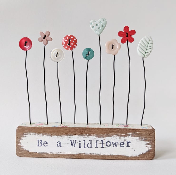 Button flowers grow in a row in this little garden with a clay leaf and clay heart. They stand on their wire stalks in a wooden block with a decoupaged floral top.