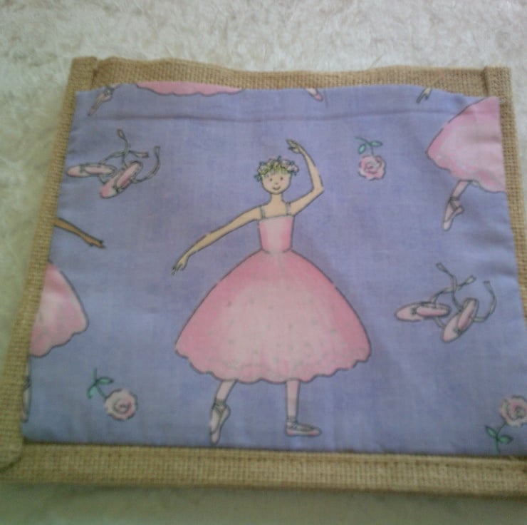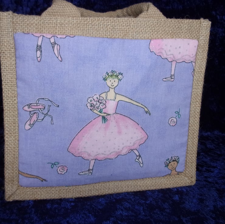 The bag itself measures approximately 22 x 20 x 13 cm (9 x 8 x 5 inches). The fabric pocket - which has been hand sewn onto the bag has a design of a ballerina in a pink dress with a bunch of flowers on a lavender background.