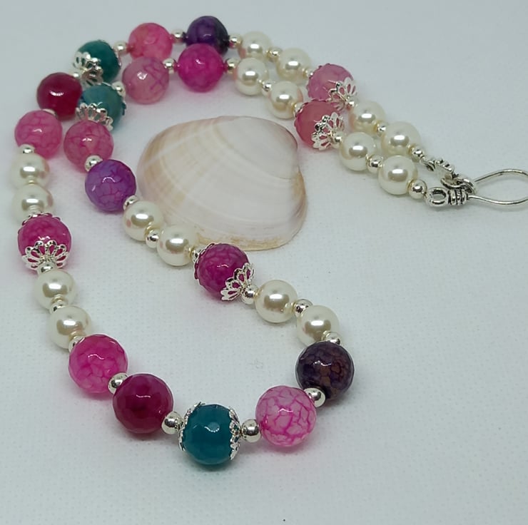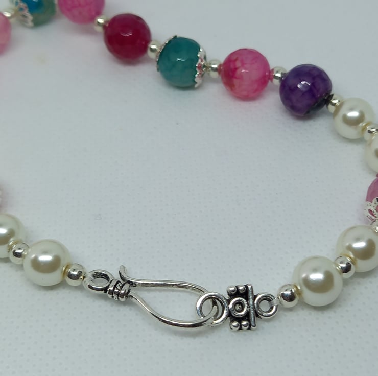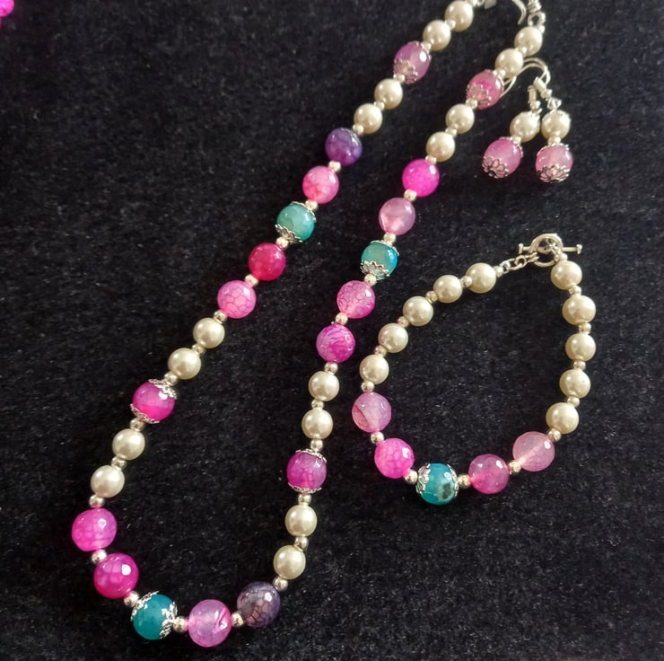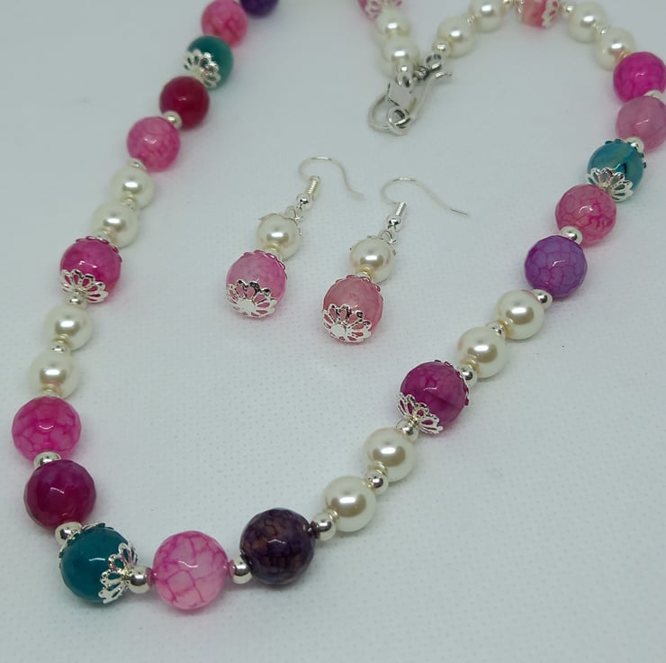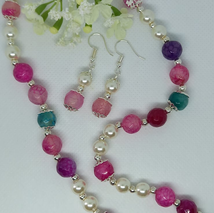 Jewel tones abound in this beaded necklace and earrings set. Facetted 10mm agate stones in shades of pink, purple and green, interspersed with cream 8mm glass pearls, silver tone spacer beads and bead caps. Fastens easily with a tibetan style hook and loop. The matching earrings are comprised of facetted agate beads with glass pearls, silver tone spacer beads and bead caps with silver plated ear hooks.