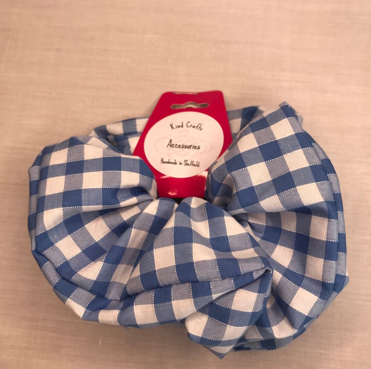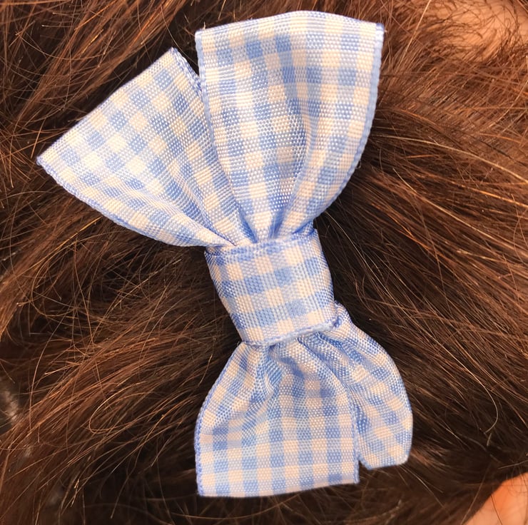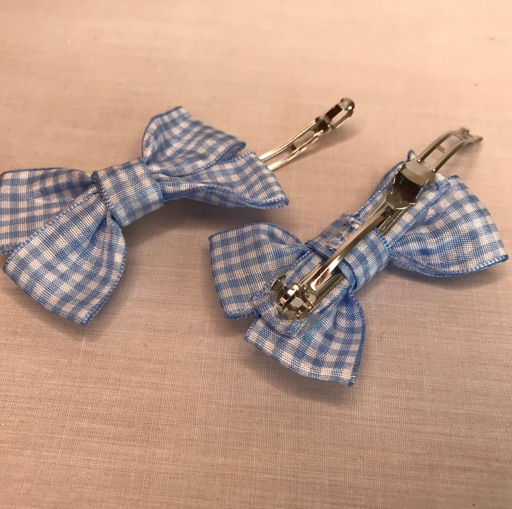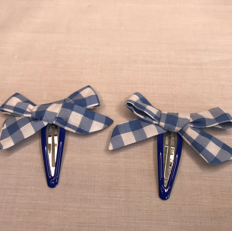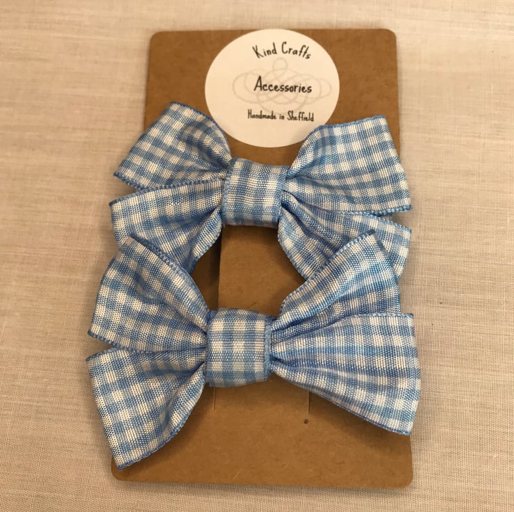 Handmade bow clips, scrunchies, hair bands, made using a blue gingham fabric and ribbon to match school uniform