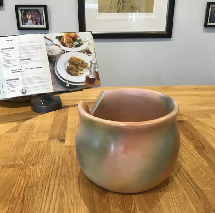 Handmade by me from locally sourced Sycamore wood which is plain in colour and grain has benefitted from the addition of various bright colours in a random arrangement resulting in an attractive and unique piece. It has a durable protective semi-gloss cellulose finish. Being fabricated from wood it is more durable than those made from ceramic material.