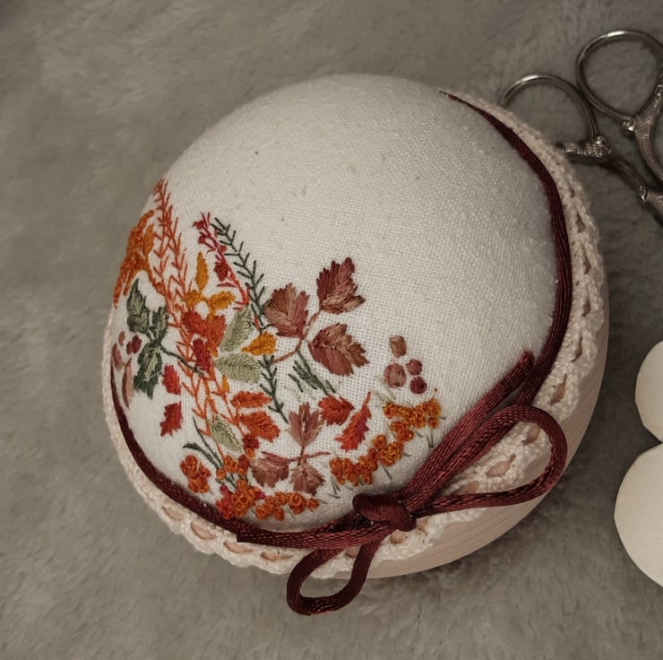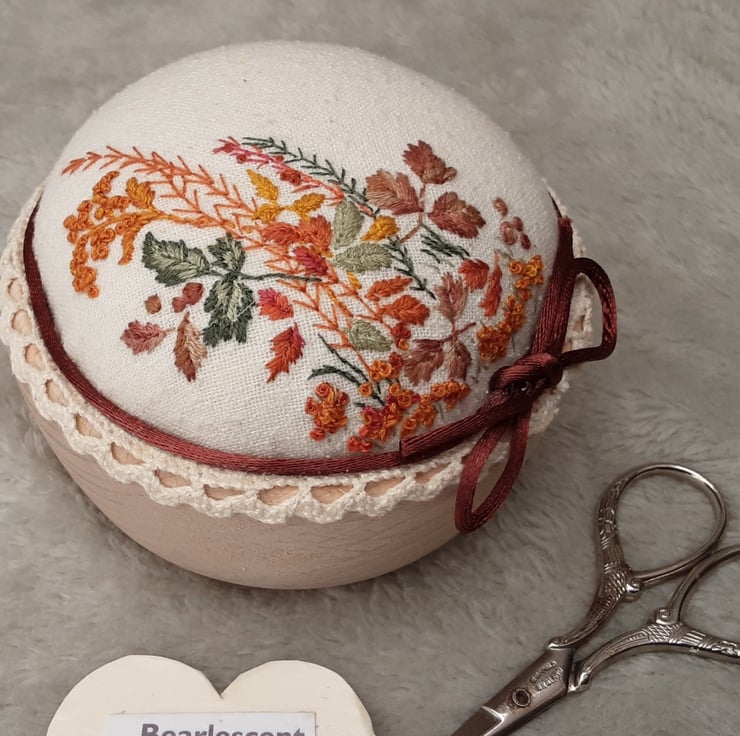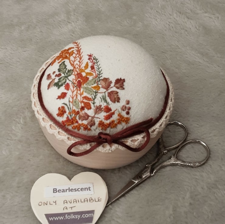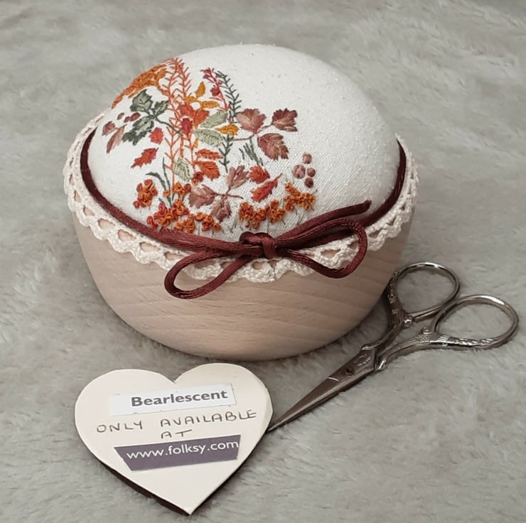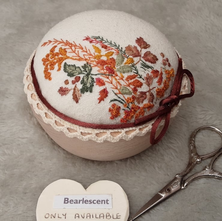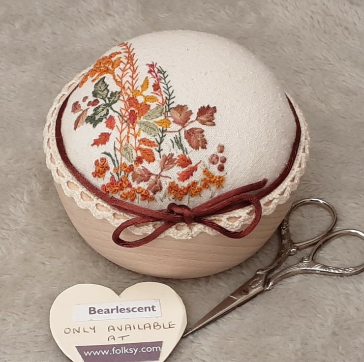 A unique hand embroidered pin cushion created and designed by Bearlescent