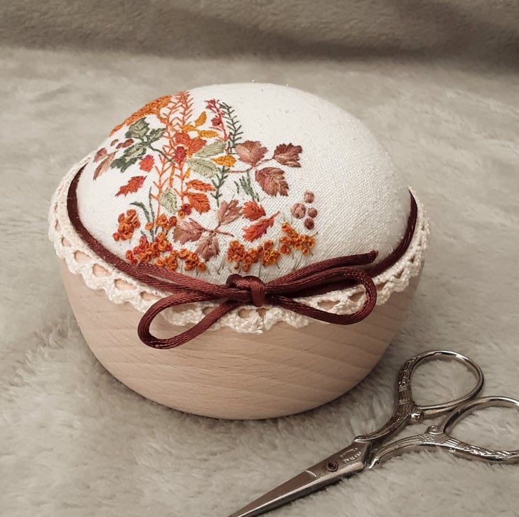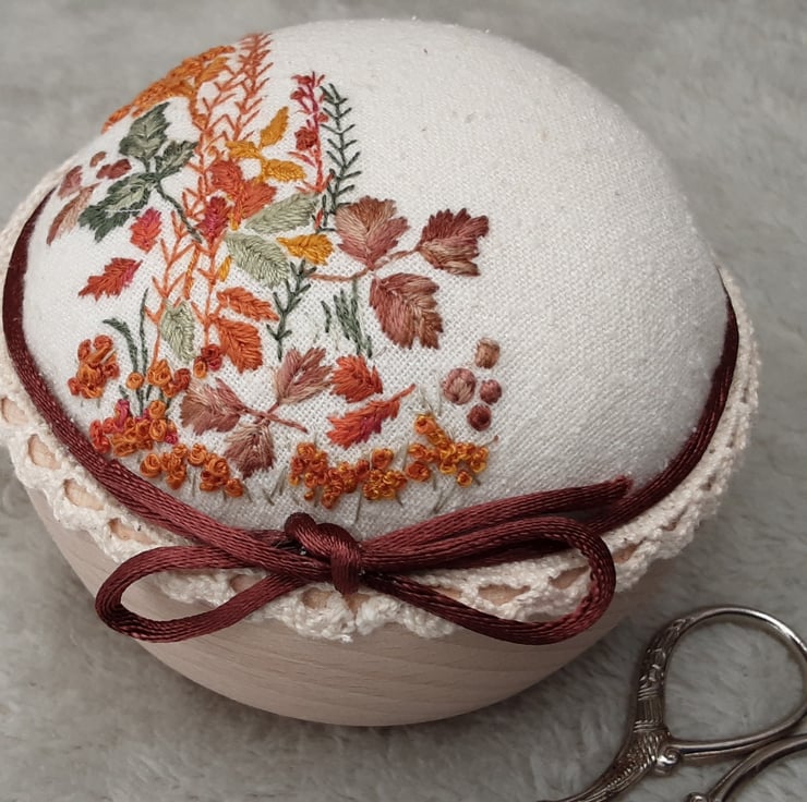 I have used an autumn colourway of rich terracottas, golds, rust, tan and greens, hand embroidered using various threads and stitches. A lovely keepsake pincushion with an Autumn theme, of falling leaves and bare branches in lovely rich colours.
