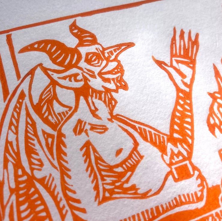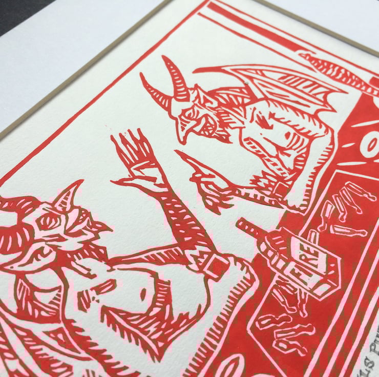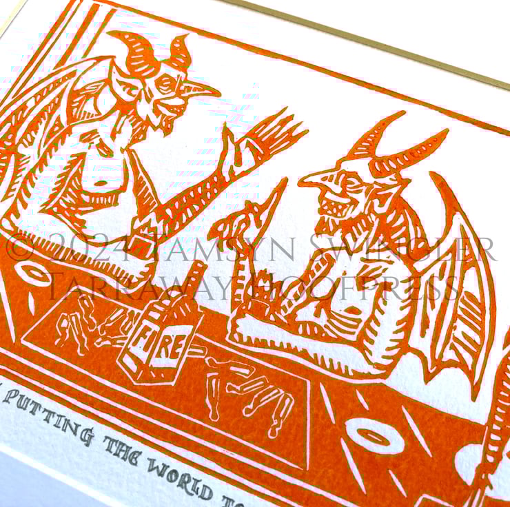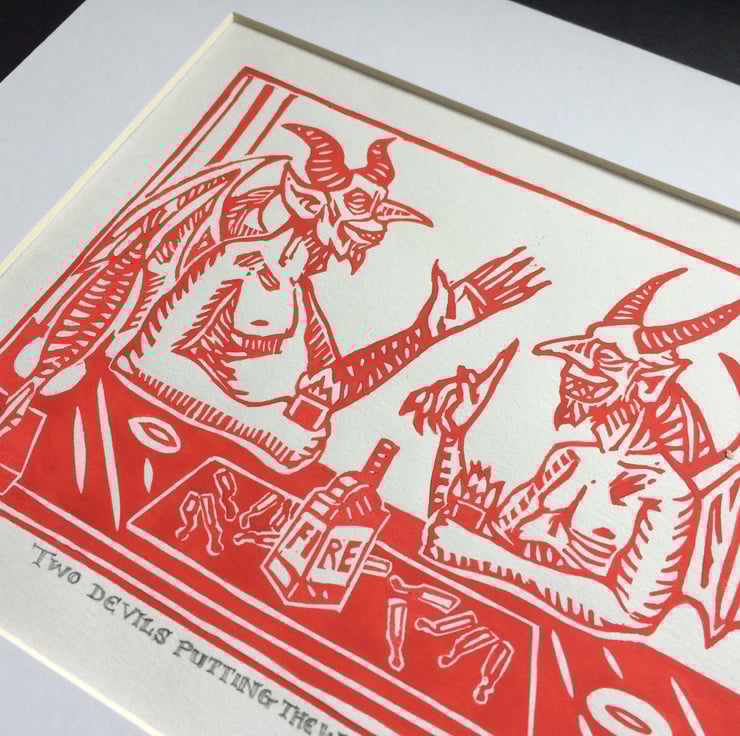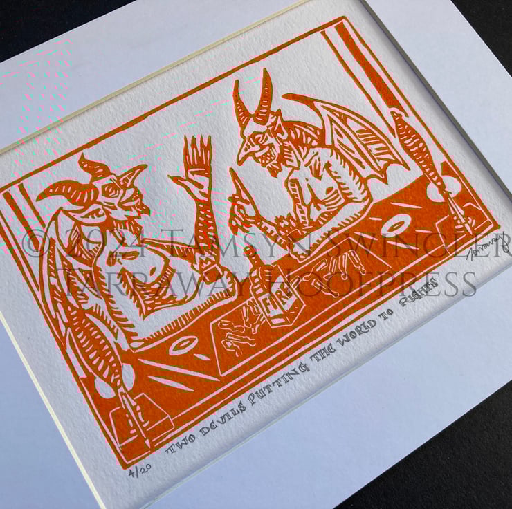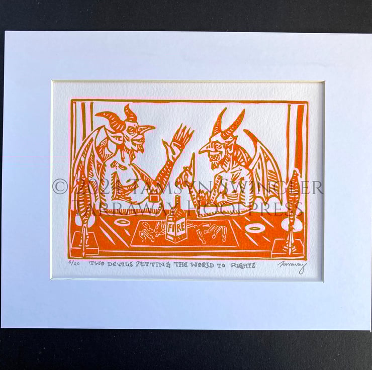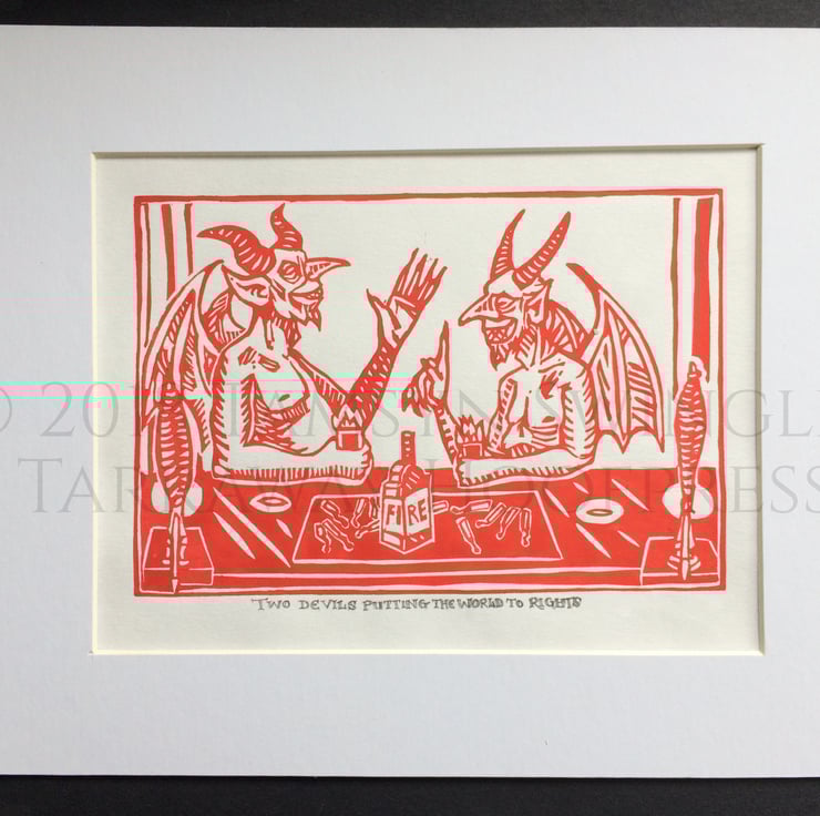 Two Devils Putting the World to Rights - In Red or Orange - Ltd. Ed Linoprint