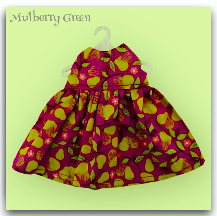 A pretty little dress in a pears design on a blackberry background to fit the Mulberry Green characters. The dress is made from best quality cotton and has a full skirt and a lined bodice.