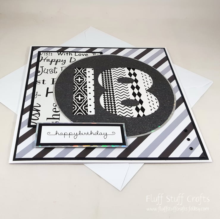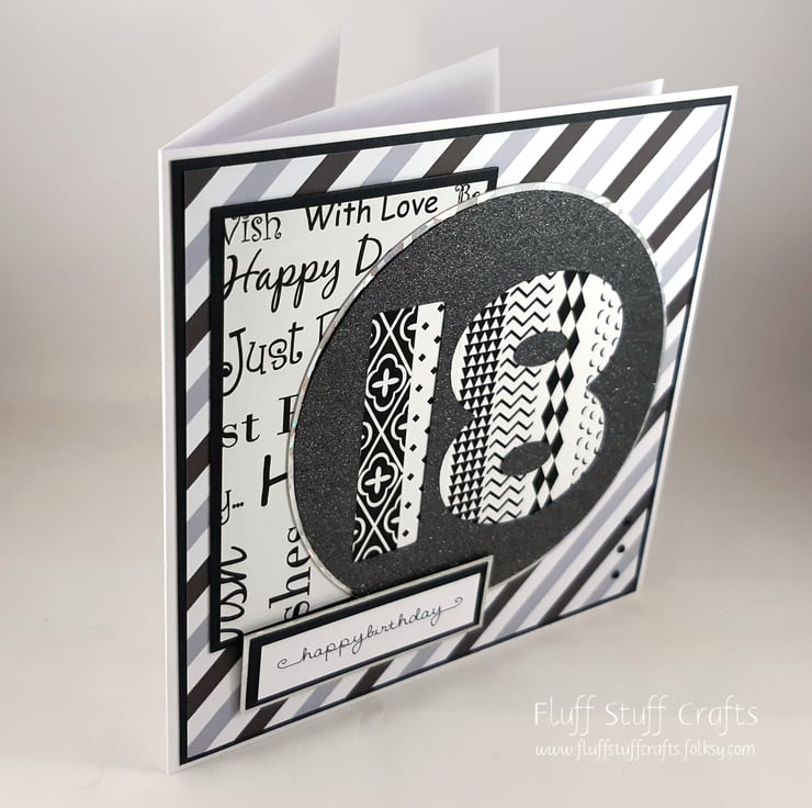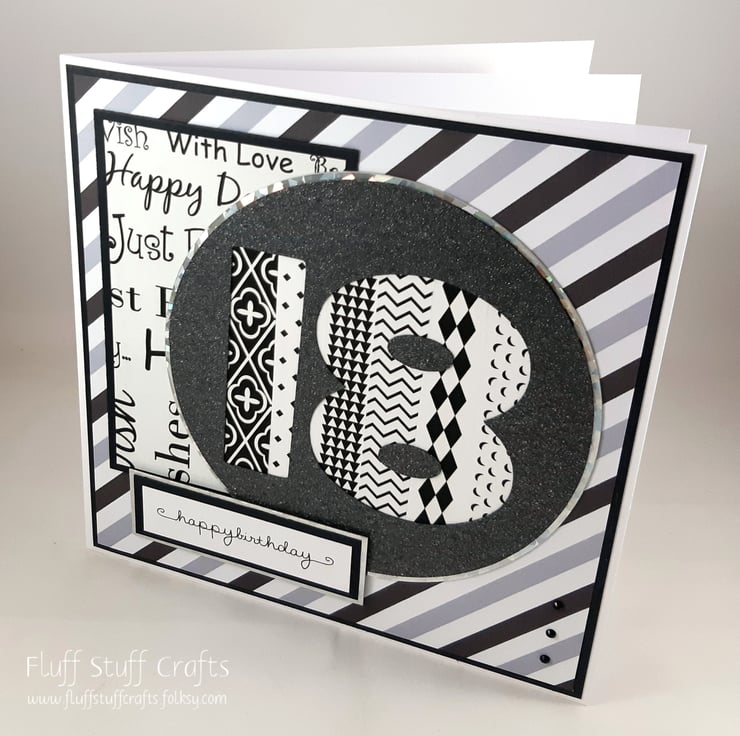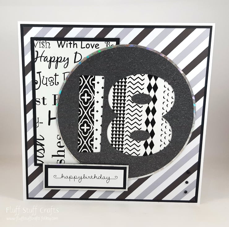 Square 18th birthday card in black, white and grey. The card features a large glittered disc of grey card die cut with the number 18. The background of the number 18 has been created by multiple strips of patterned black and white washi tape. The disc and the sentiment 'happy birthday' have been mounted onto holographic silver card, over a striped background. The card is embellished with 3 small black gems.
