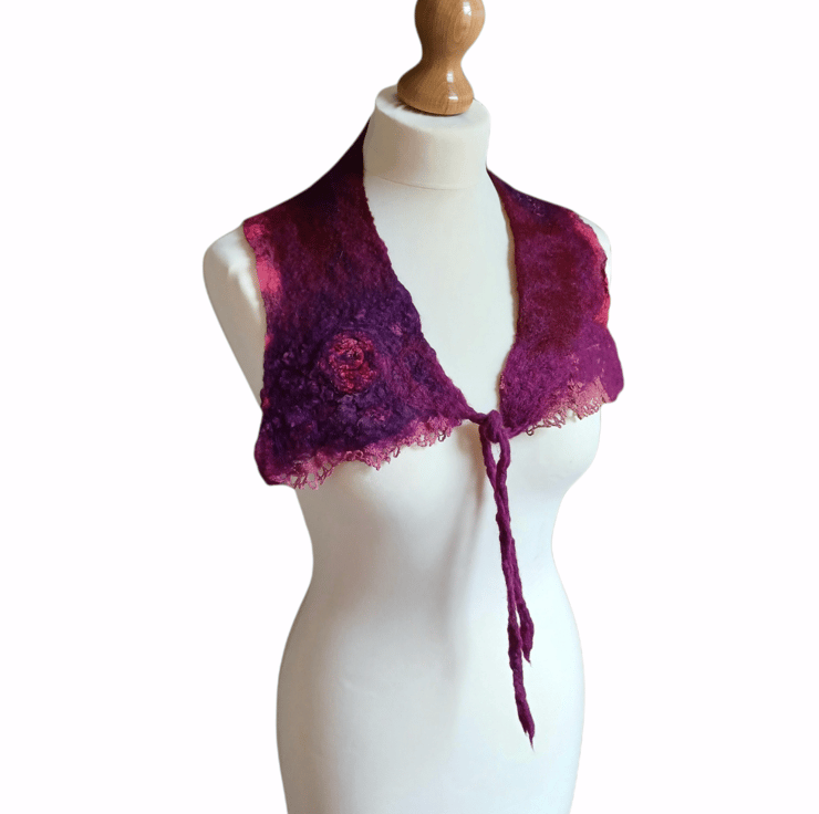Some parts of the nuno felted edging are layers of painted crinkled silk chiffon, dyed antique cotton crocheted lace on the front edge and velvety yarn embellishment. There is some sequin embellishment felted into the back.