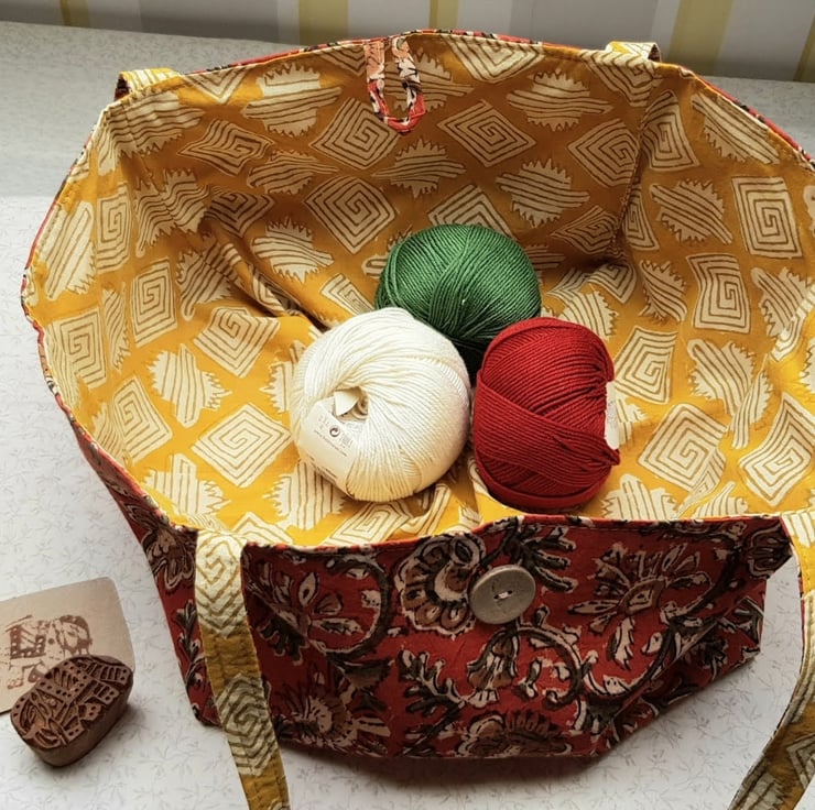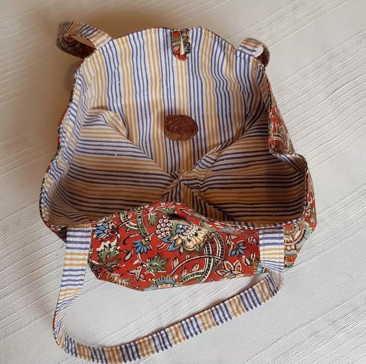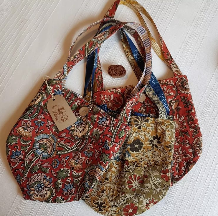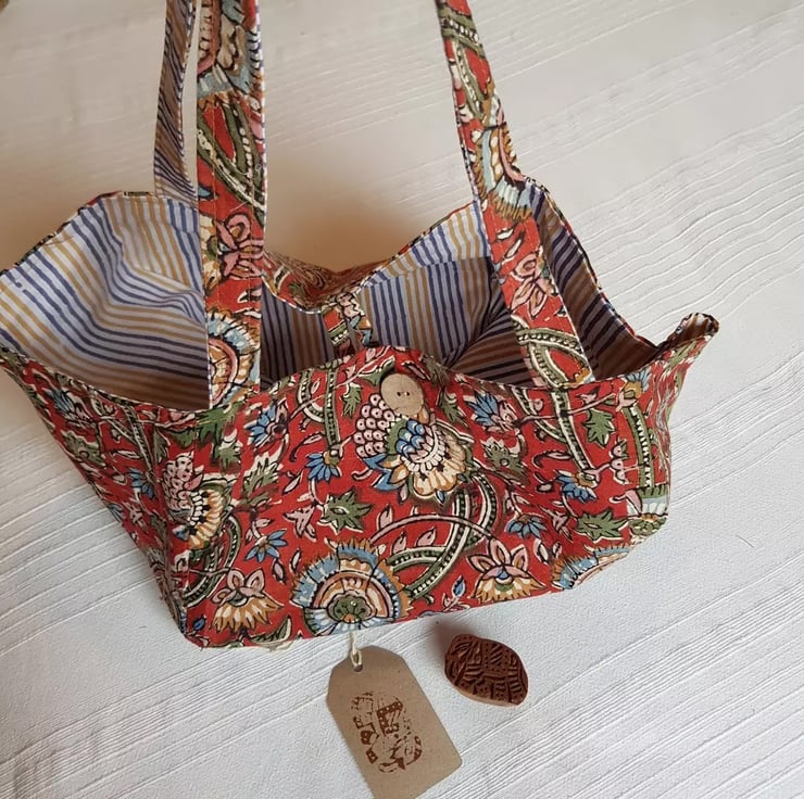 These generously proportioned bags are hand sewn by me using ethically sourced Indian block print cotton. Natural vegetable dyes are used in the production of the fabric which is hand printed in the Jaipur region of India using traditional skills.