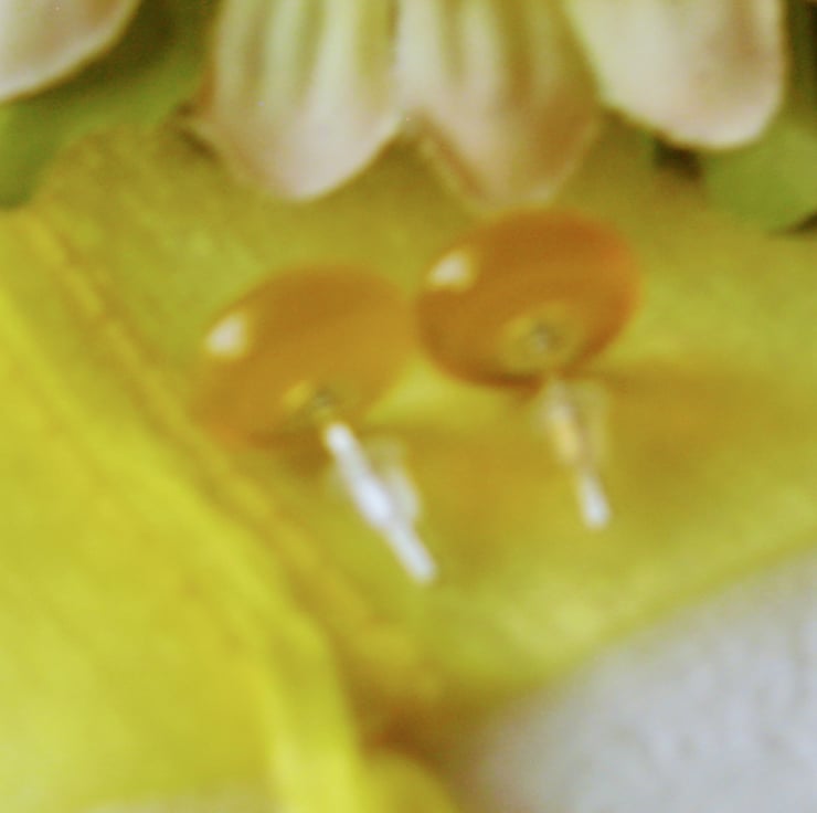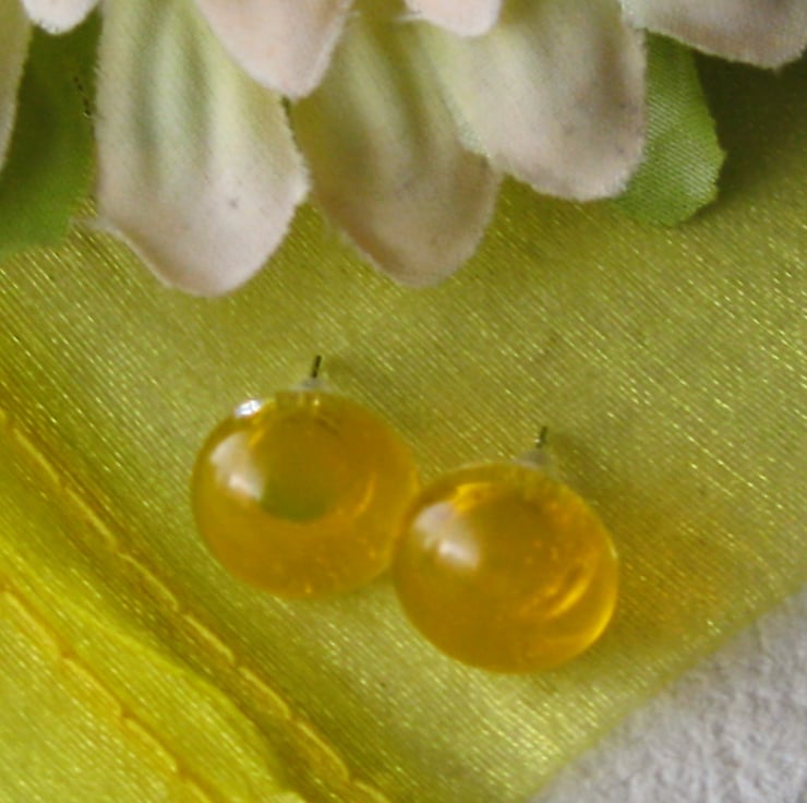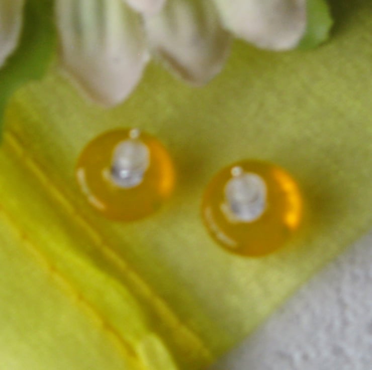 Pair of transparent golden yellow on clear 13mm round stud earrings. Handmade from quality Bullseye glass. Created by kiln fusion. Sterling silver ear posts with soft rubber hypoallergenic safety stoppers.