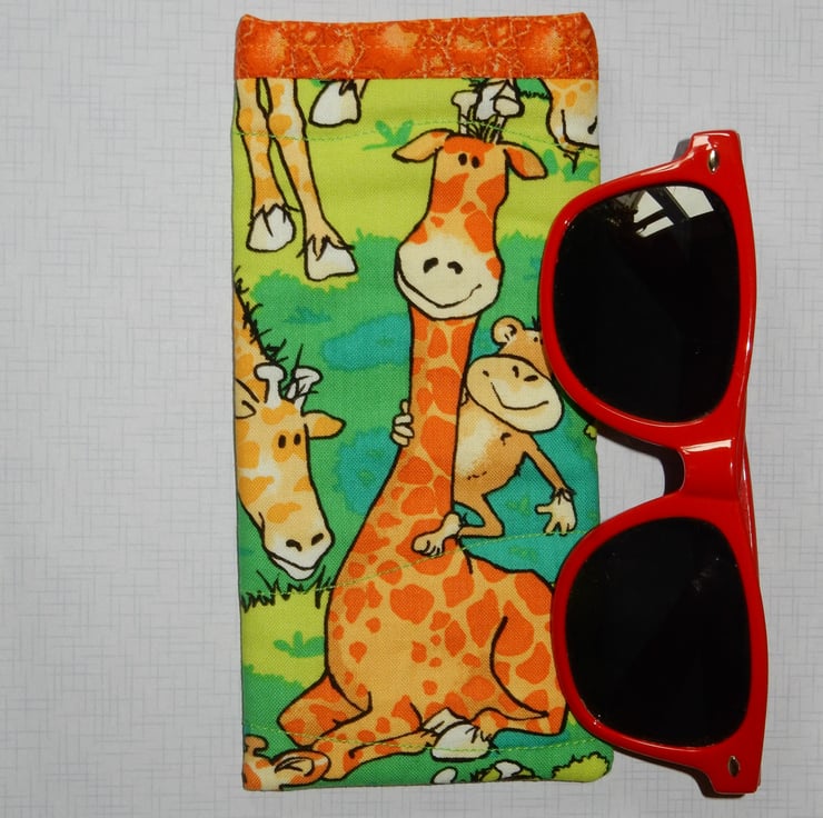 This is a fun glasses case featuring cute giraffes and a monkey friend, with a tortoise on the back too. The case is made from cotton fabric with a layer of wadding for protection and a toning print fabric for the trim and lining. This is a slip in style glasses case, if you require a case which fastens please view my other listings.