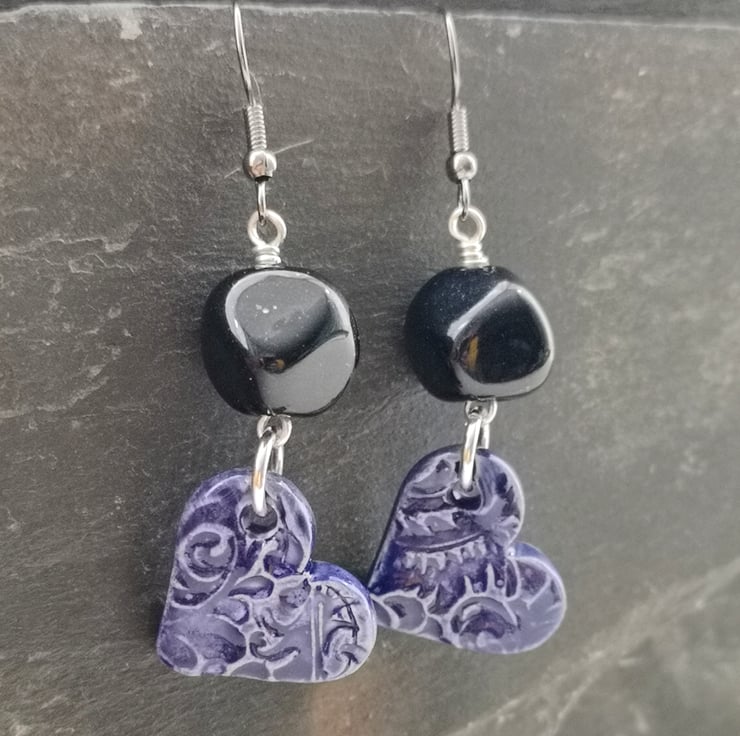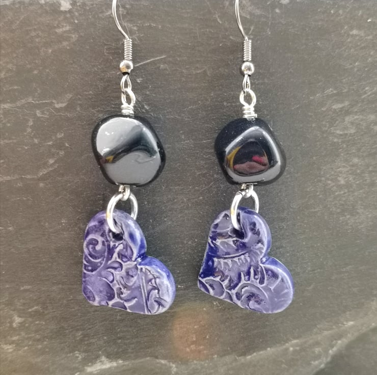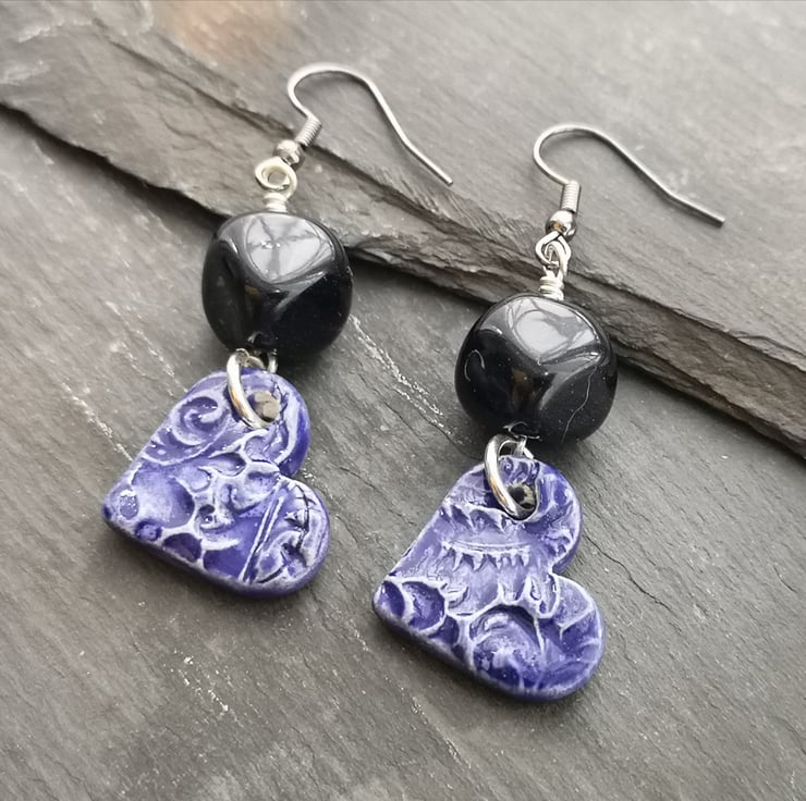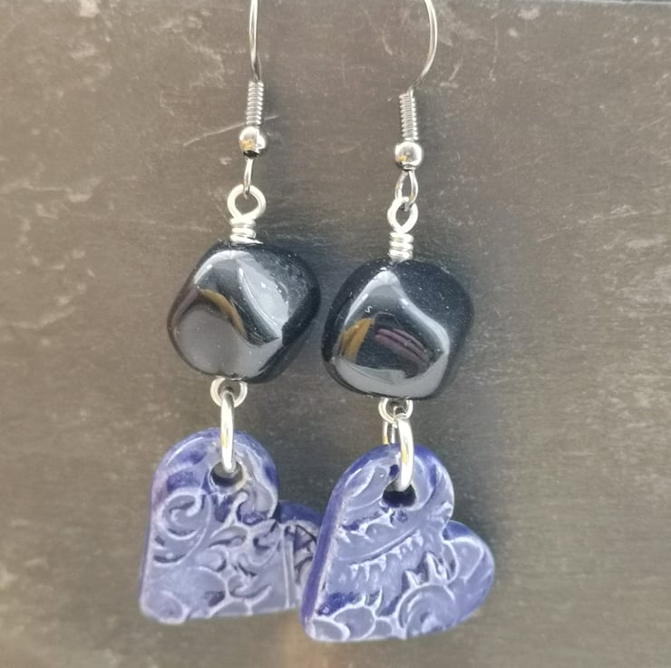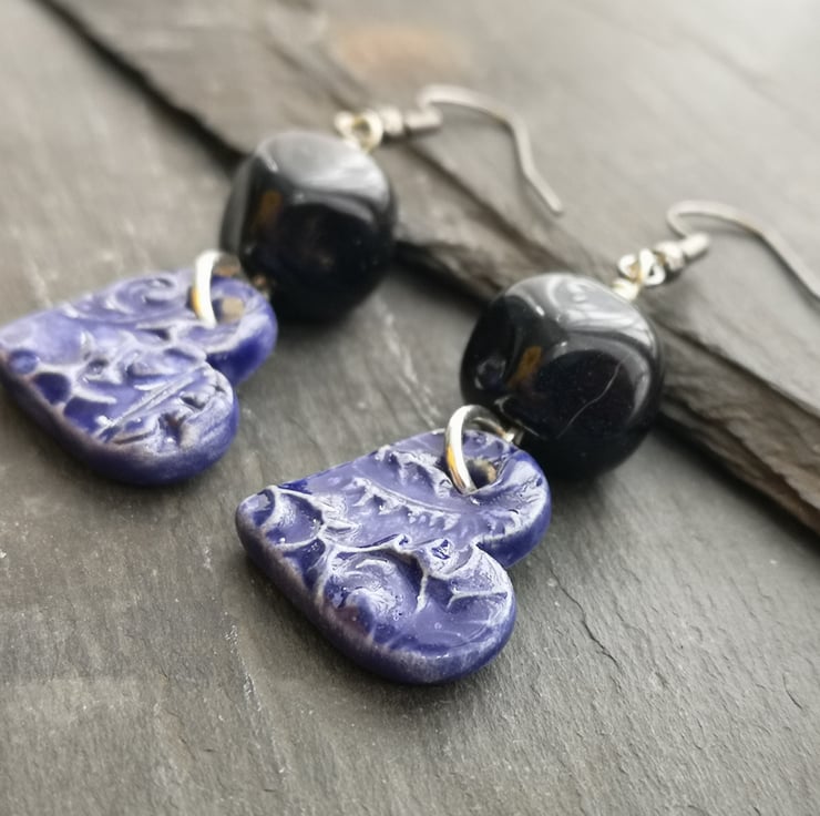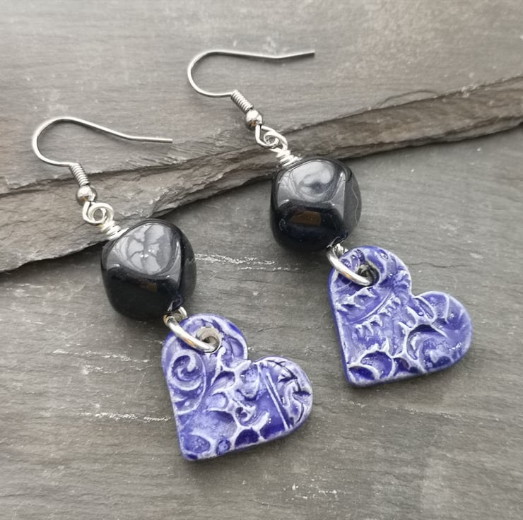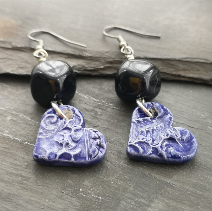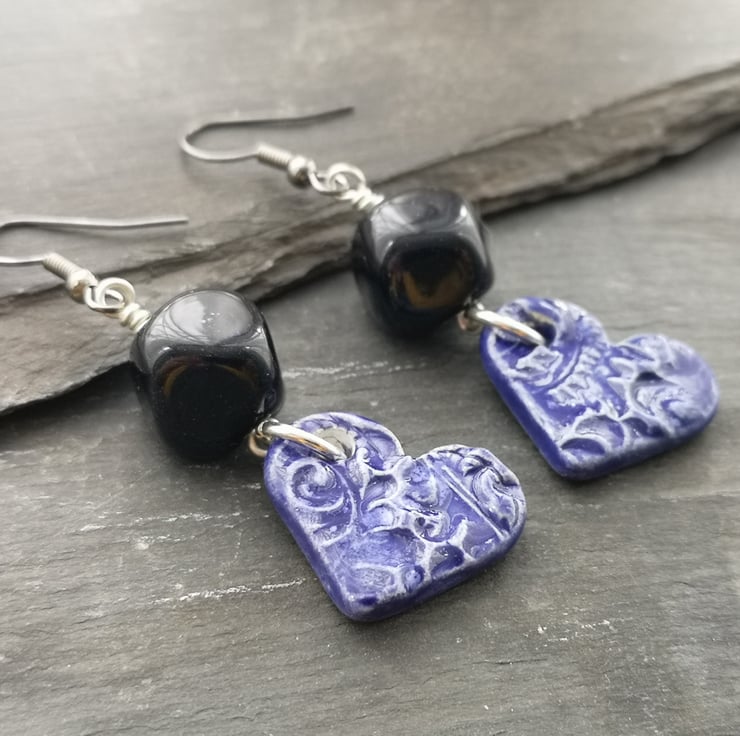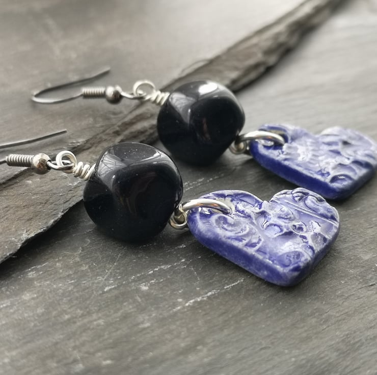 These earrings have been made with chunky glass nuggets in darkest navy blue. They have a subtle shimmer which is very hard to capture in my photos. Beneath these hang blue ceramic hearts with a raised pattern, which makes them very tactile, great if you're the sort of person who fiddles with their jewellery a lot. Gunmetal ear wires complete the earrings.