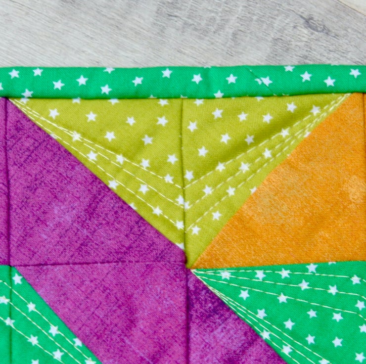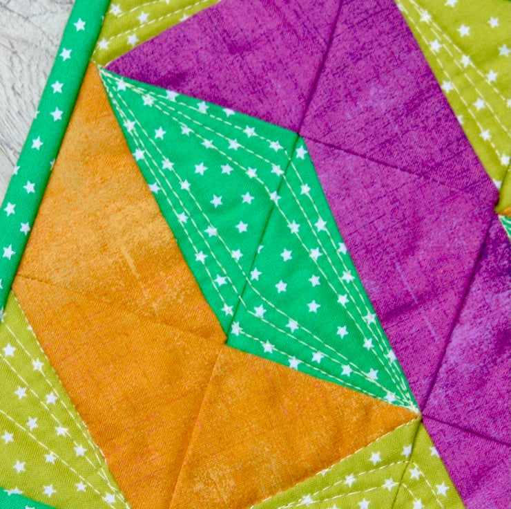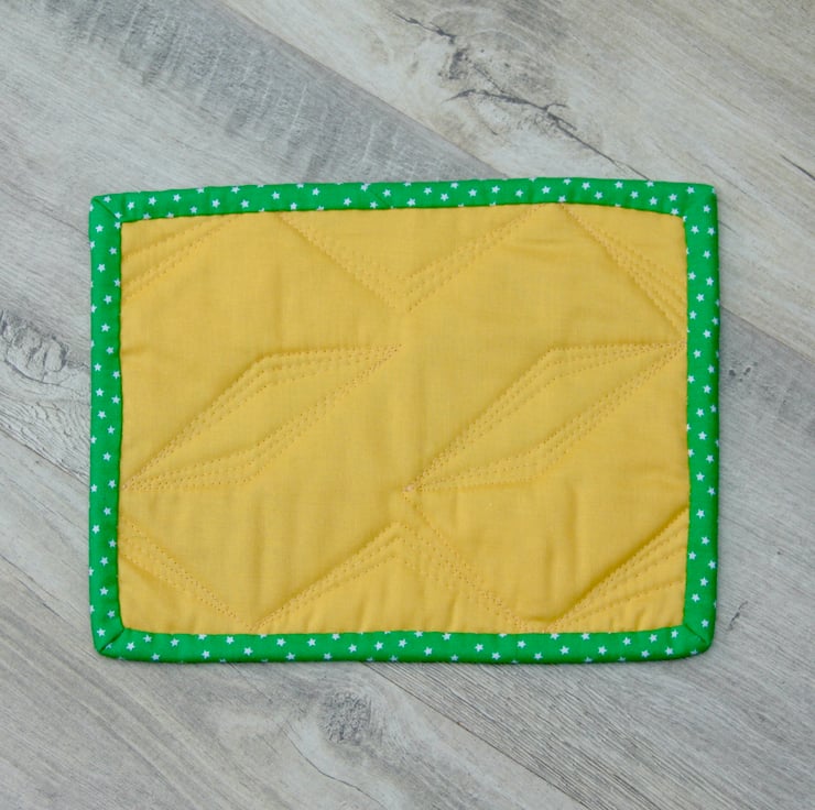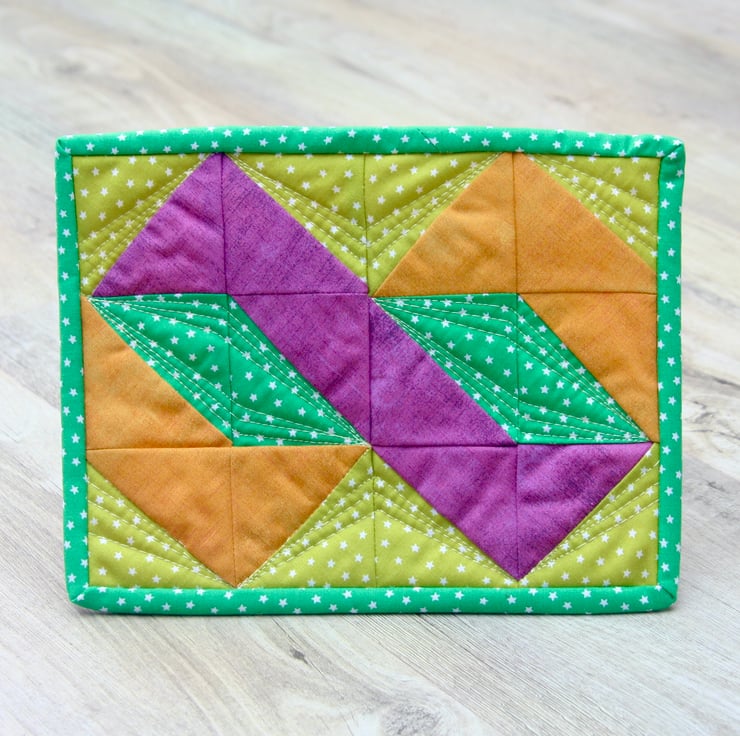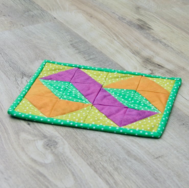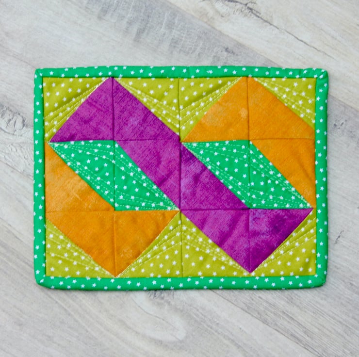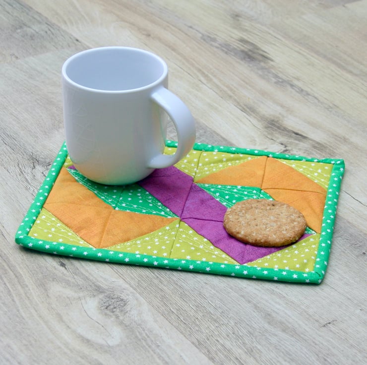 This bright and colourful mug rug, in a twisted pole patchwork design, is big enough to accommodate your drink and a cheeky biscuit.