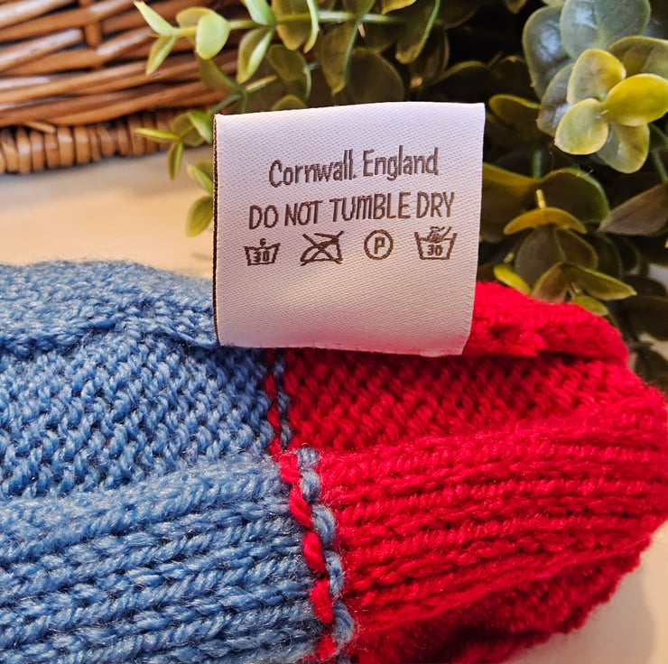 Baby knitwear is designed and hand crafted by Demelza Designs in Cornwall meeting UK baby safety standards, Only branded premuim acylic, acrylic/natural fibre blends or pure natural fibre yarns are used in baby knitwear which conforms to BS984/76 standards.