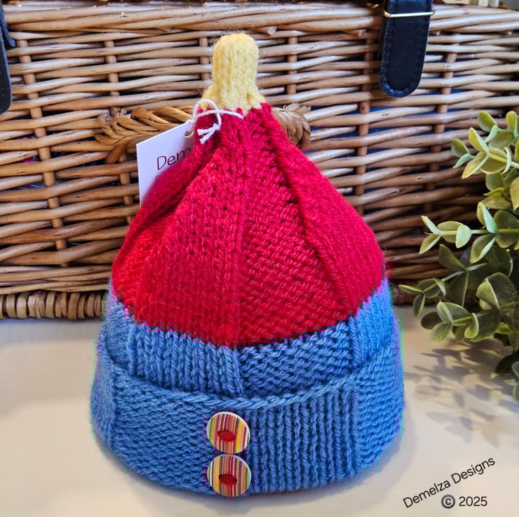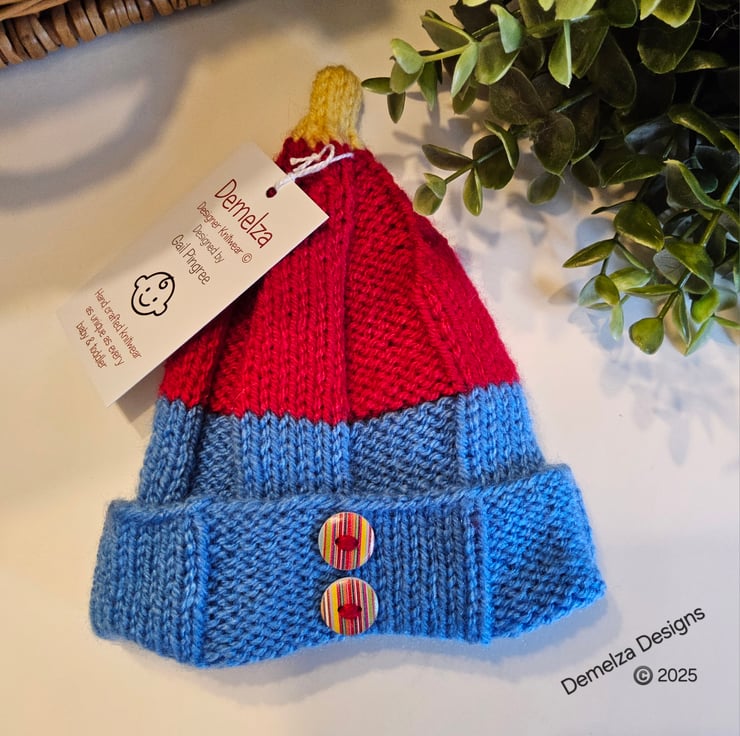 A unique eye catching newborn baby unisex pixie hat designed and hand crafted in Cornwall. The item has been created using premium acrylic machine washable yarns. These adorable little hat look so cute on young babies and a popular seller for some years. Each hat is different so they are unique.