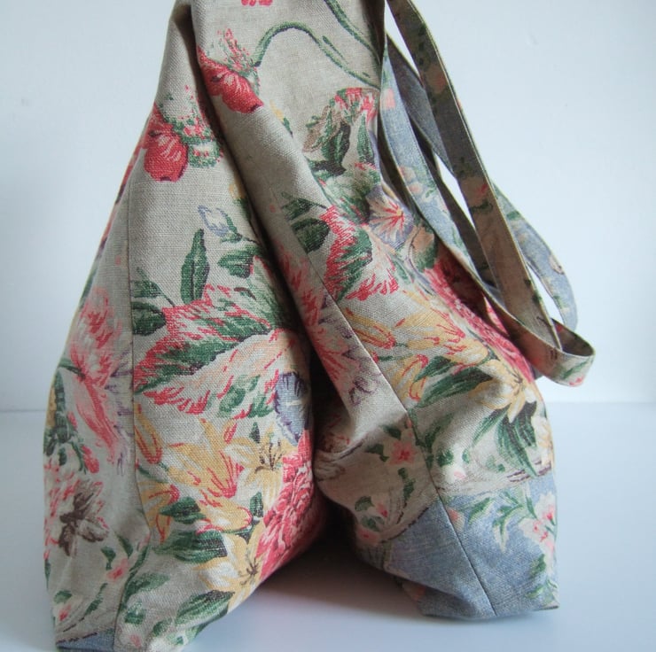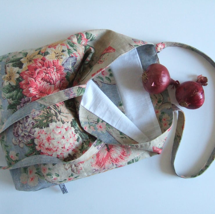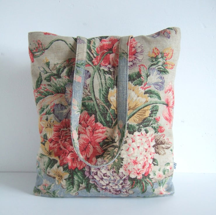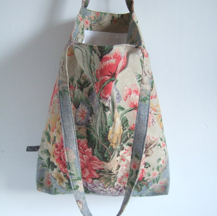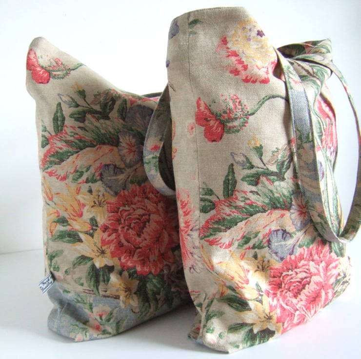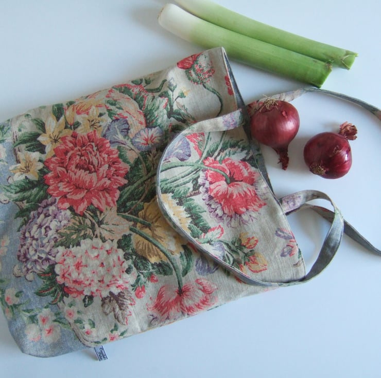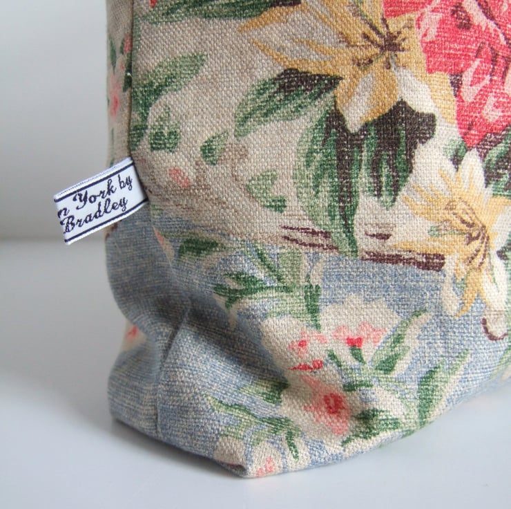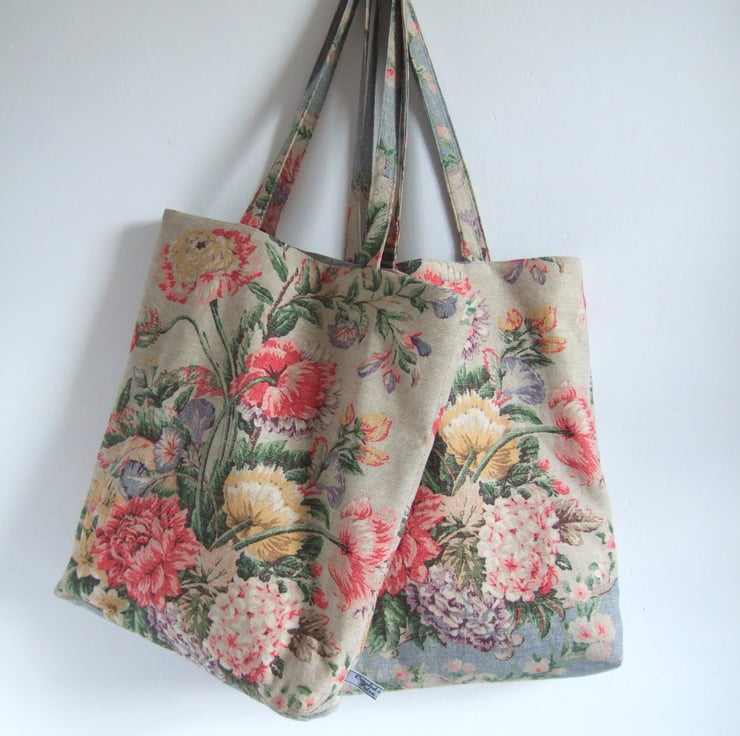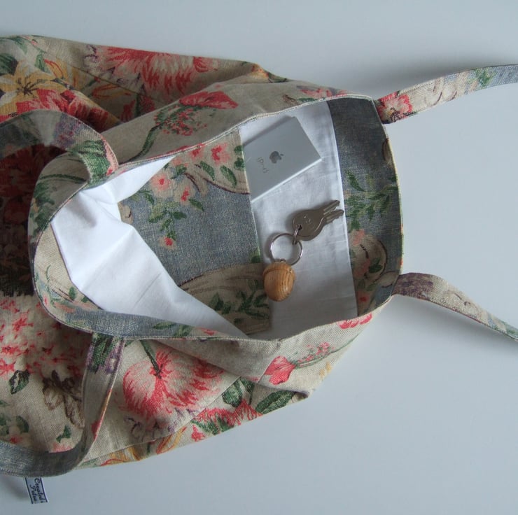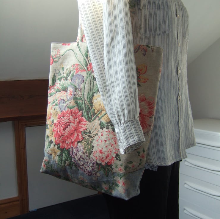 If its possible to have a tote for special occasions, then this is it. Made from a fabulous fabric remnant, it has a vintage style print of aged fabric and flowers, with that end of summer feel to it. Pretty and practical, it has a small inside pocket for your phone, is fully lined, and is made with a facing around the top for that professional finish. It is ready for carrying presents to a wedding, or wine to a garden party. It would also make a pretty yet practical Birthday present.